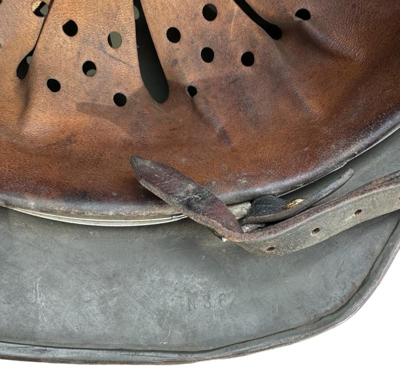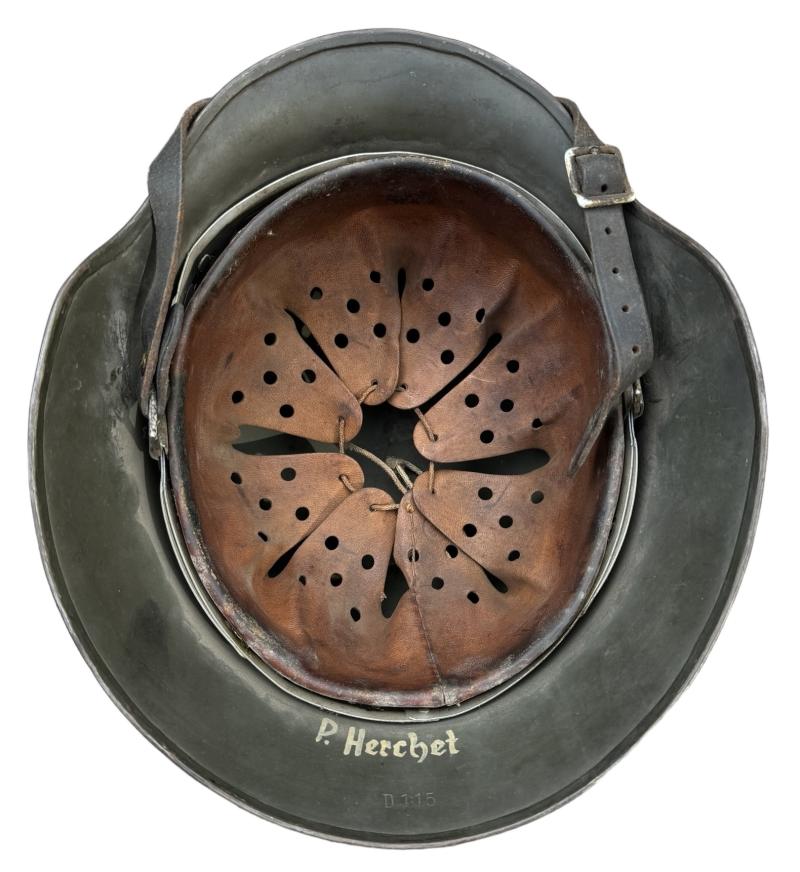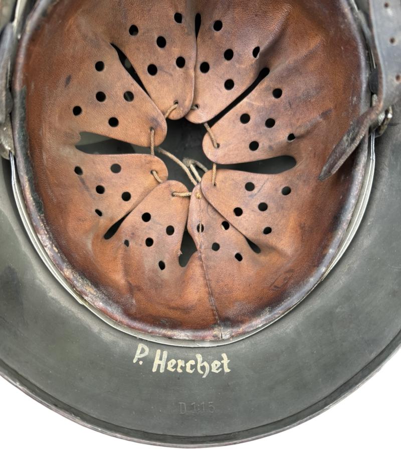 With its first type (single ring) aluminum liner in size “55”. Complete with its early helmet strap with aluminum buckle. Named “P. Herchet”