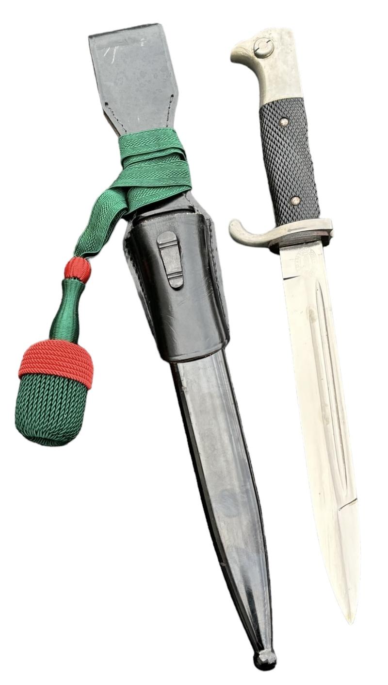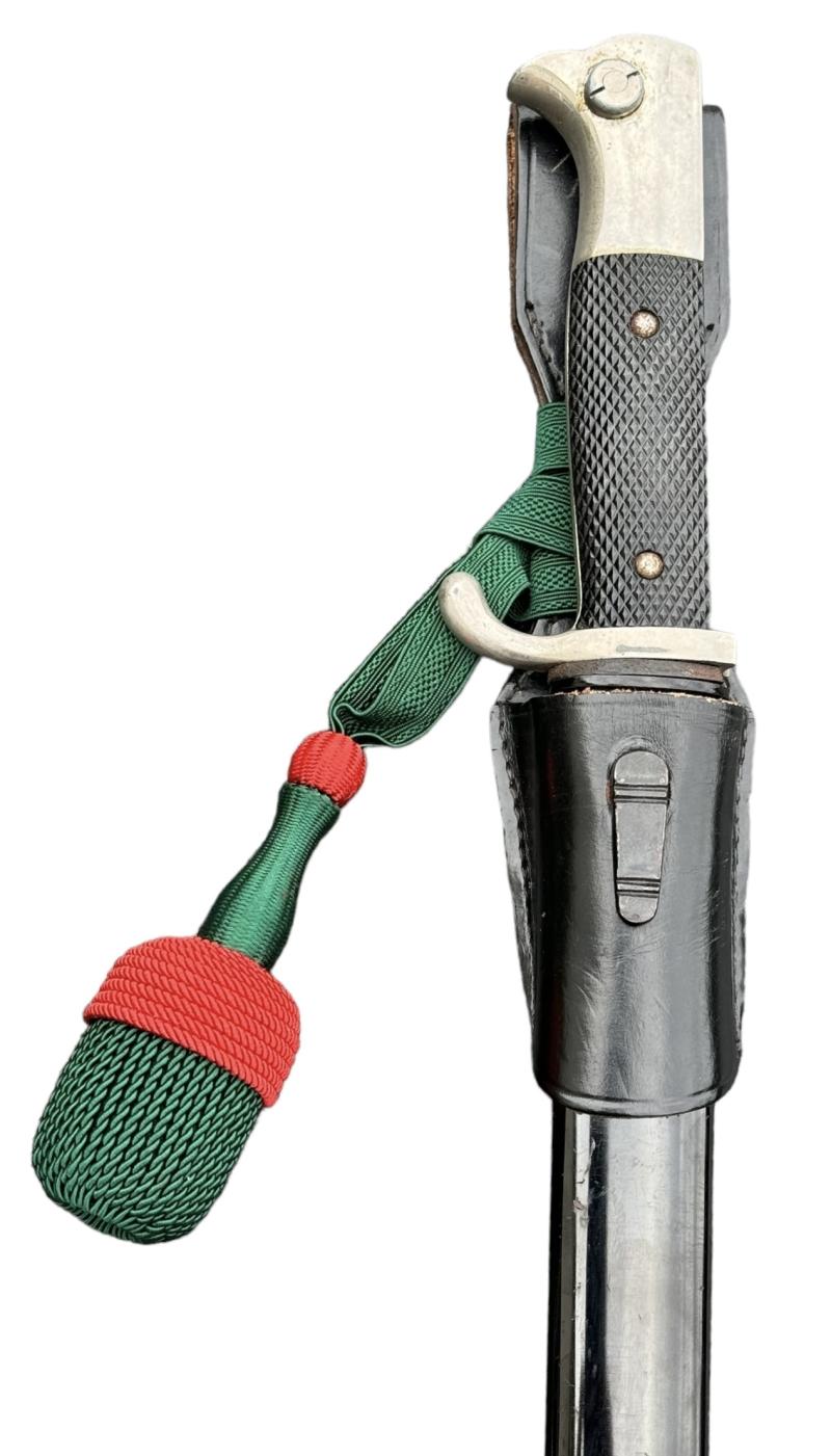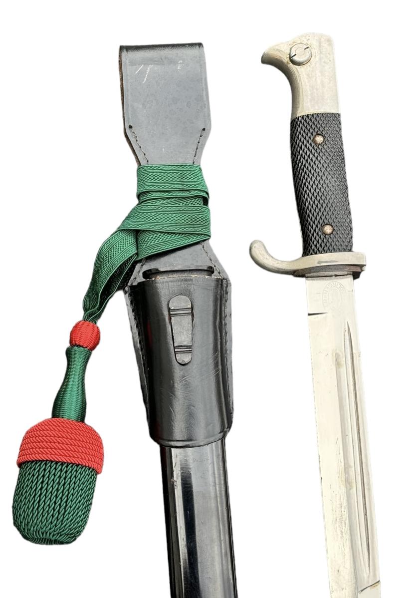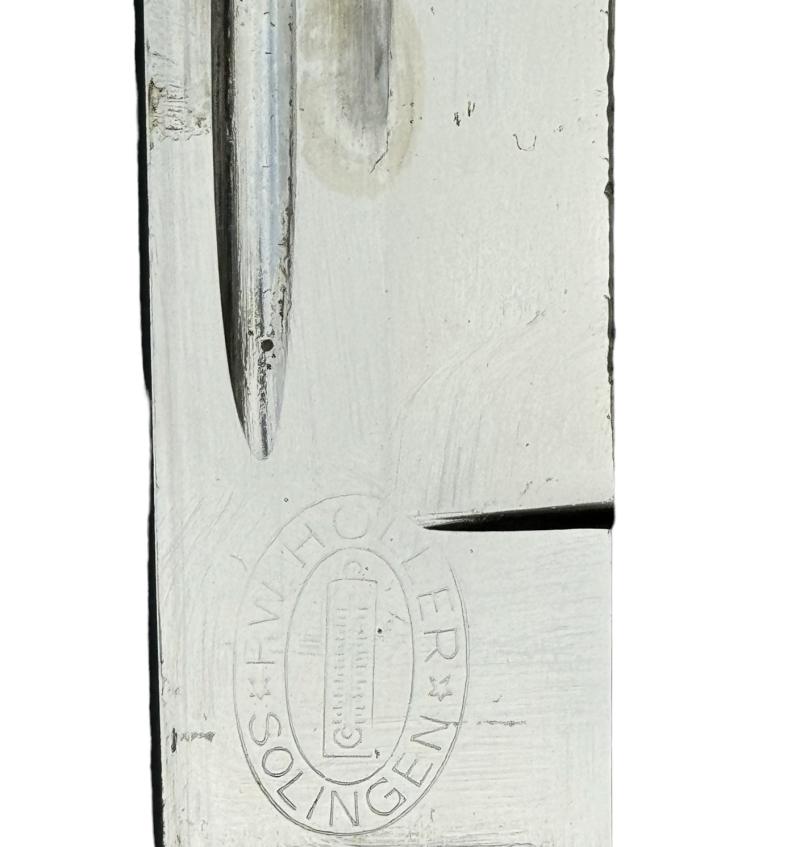 Very nice used Wehrmacht dress bayonet with Porte Pé and frog. Made by “F.W. Höller, Solingen”