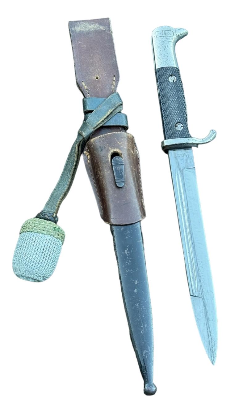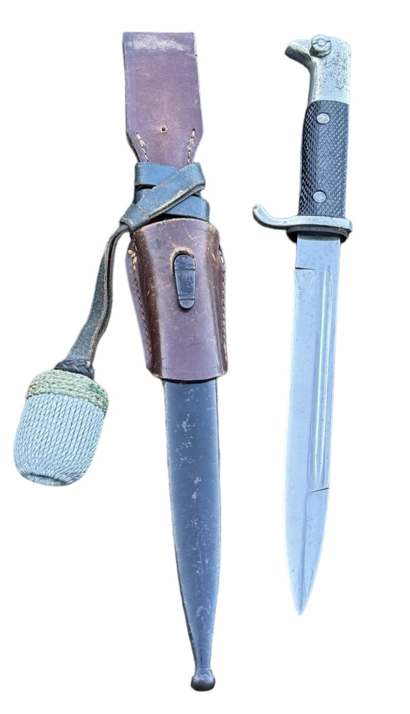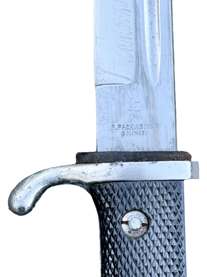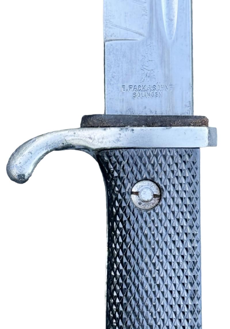 Very nice used Wehrmacht dress bayonet with Porte Pé and frog. Made by “E. Pack & Söhne, Solingen”