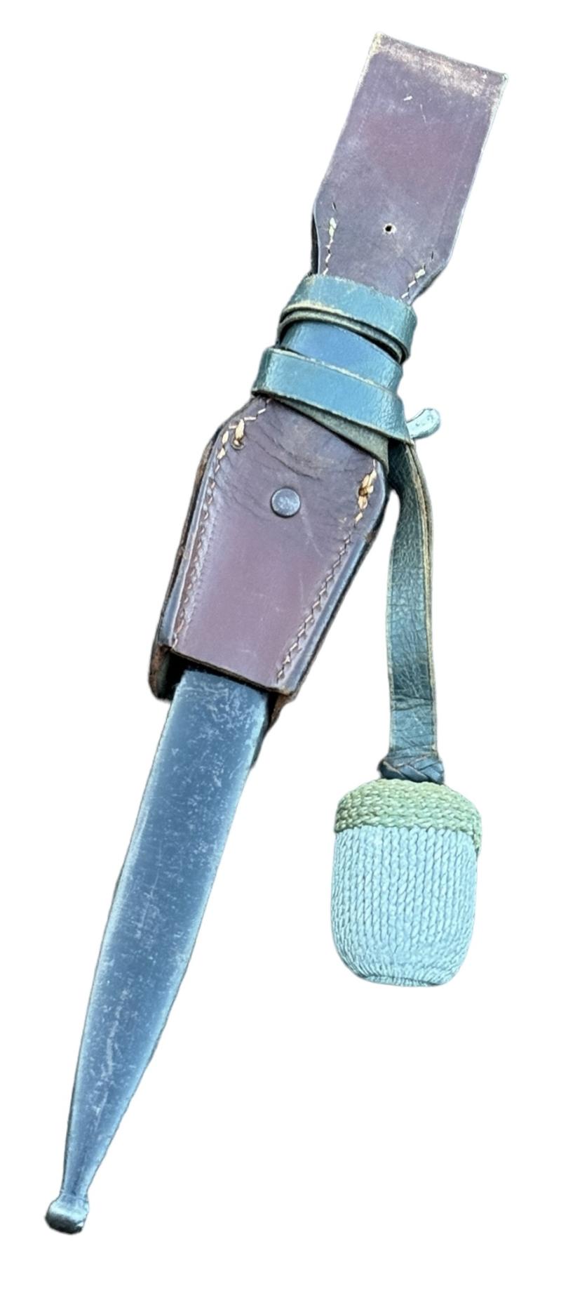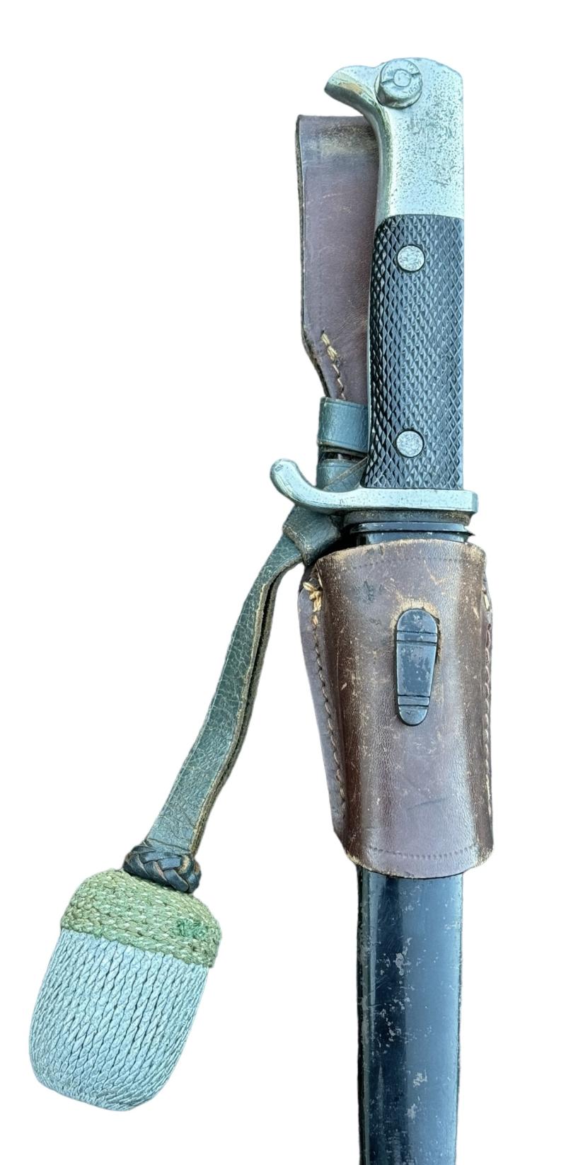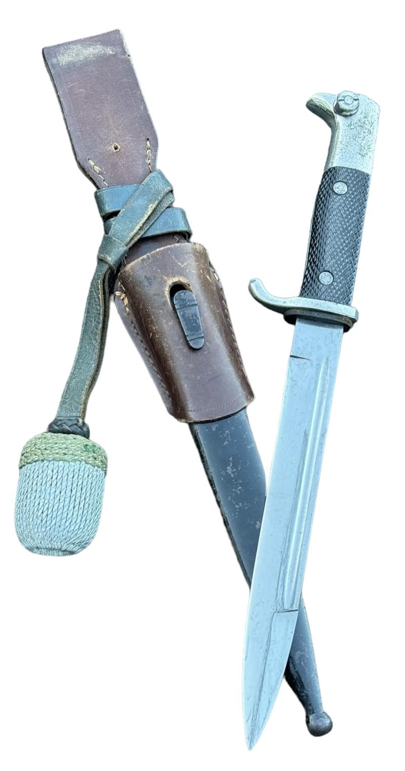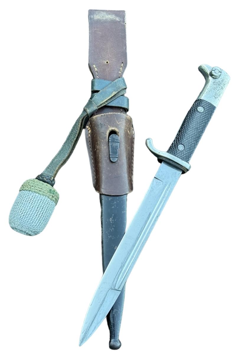 Very nice used Wehrmacht dress bayonet with Porte Pé and frog. Made by “E. Pack & Söhne, Solingen”