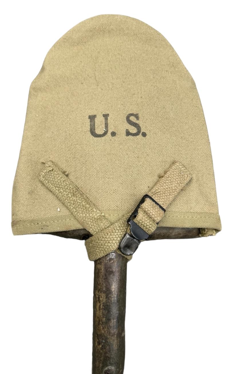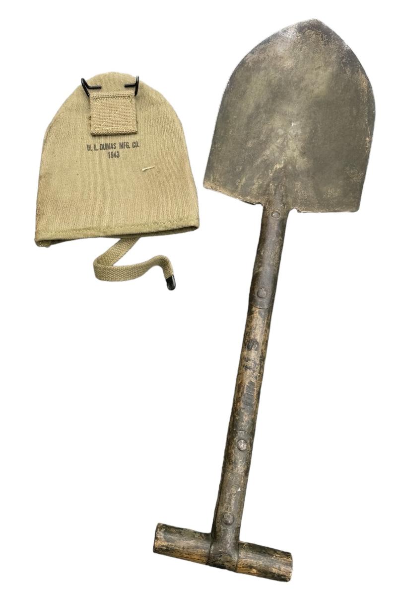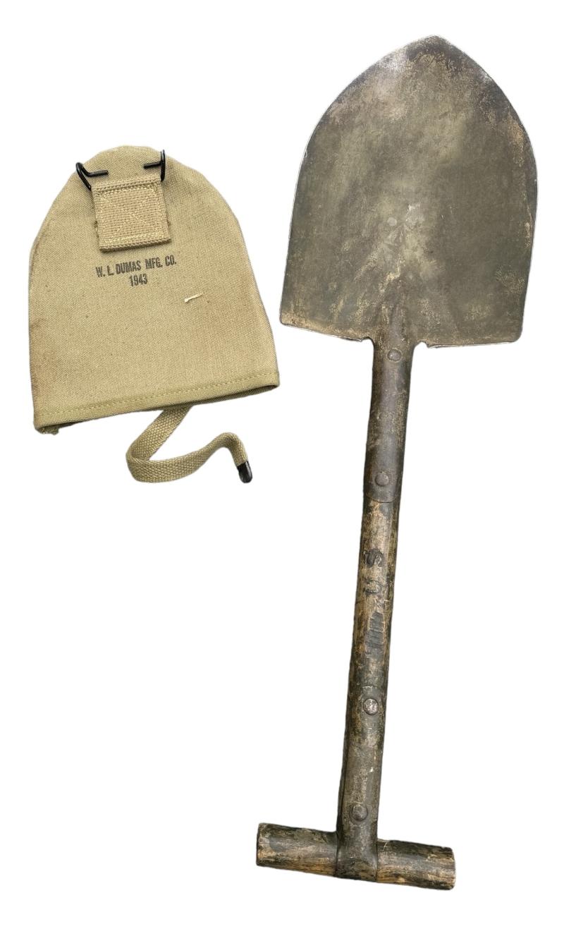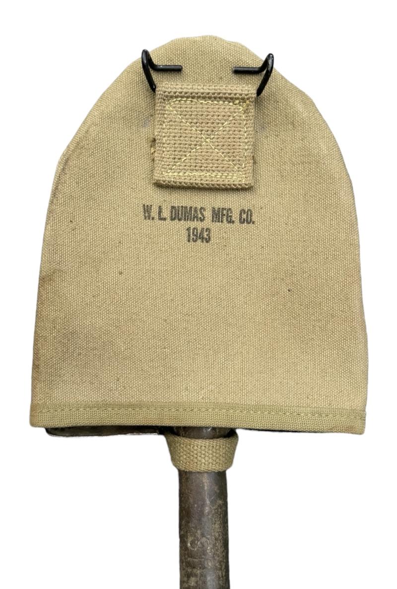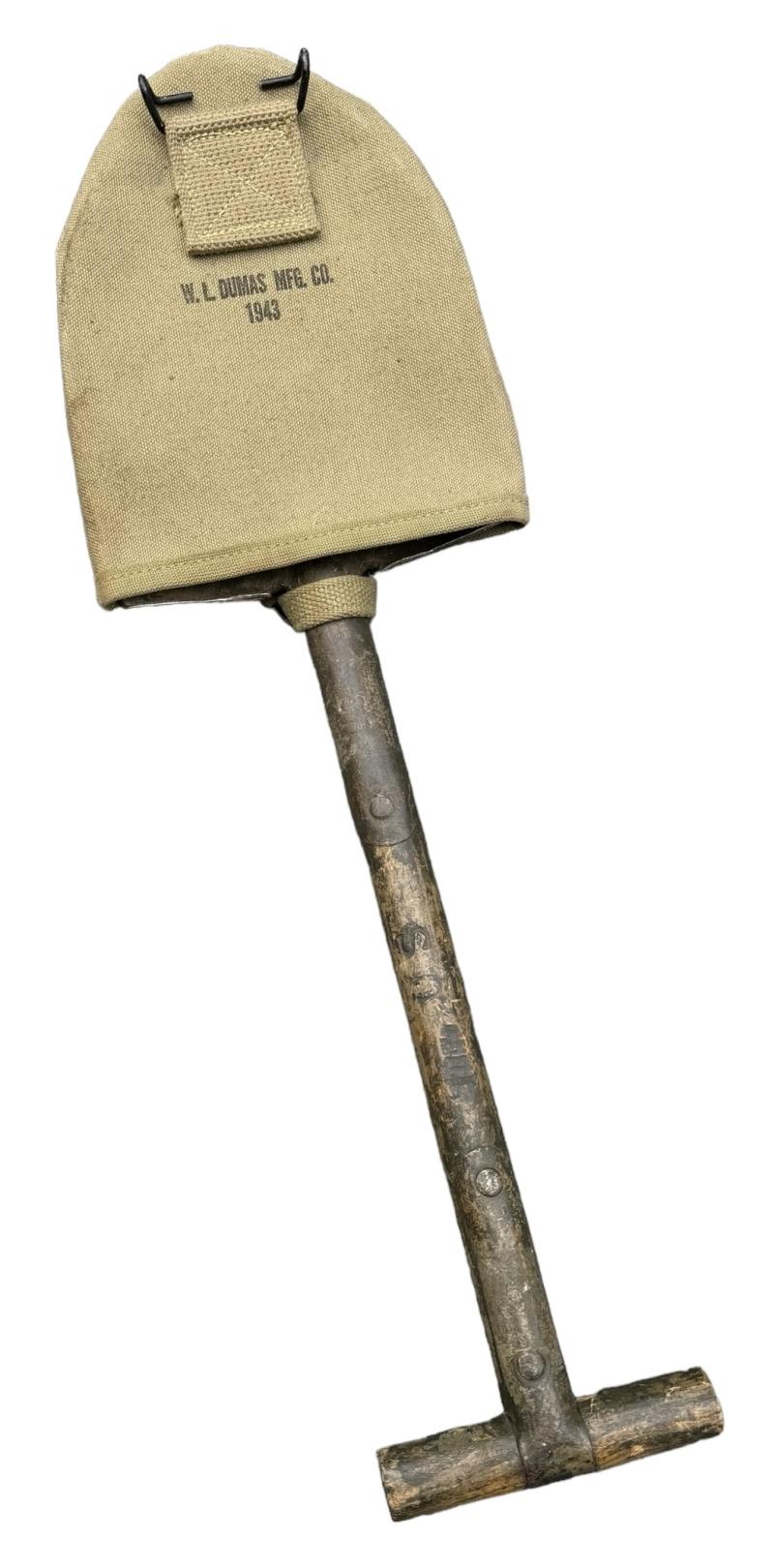 Very nice US WW2 so-called T shovel in its original cover. Shovel cover maker marked “W.L. Dumas Mfg. Co.” and dated “1943” Overal a very nice used US WW2 T shovel and cover in very good condition.