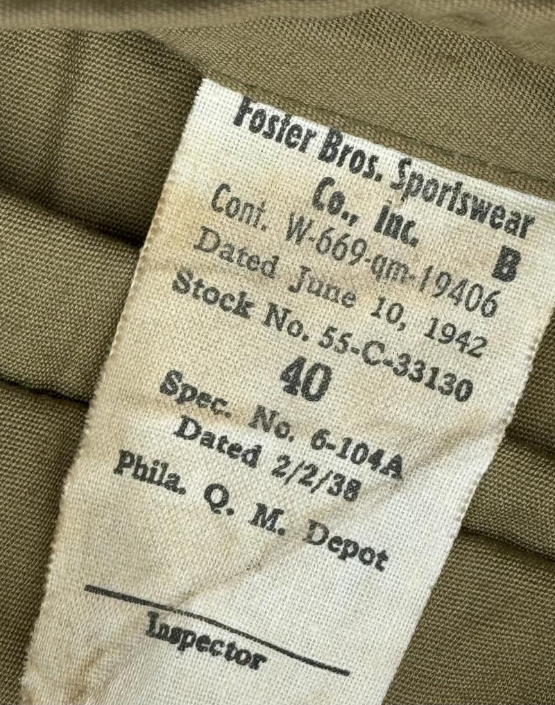 Made by “Foster Bros. Sportswear Co. Inc.” and dated “1942” in size “40”