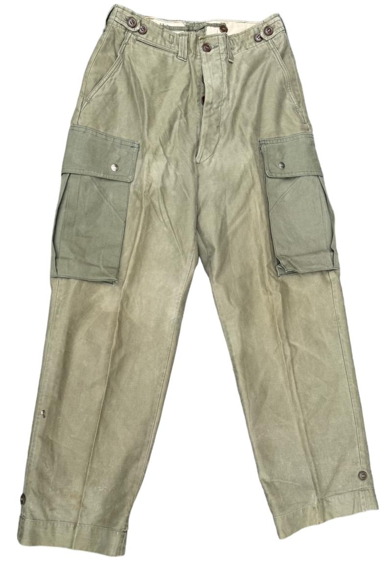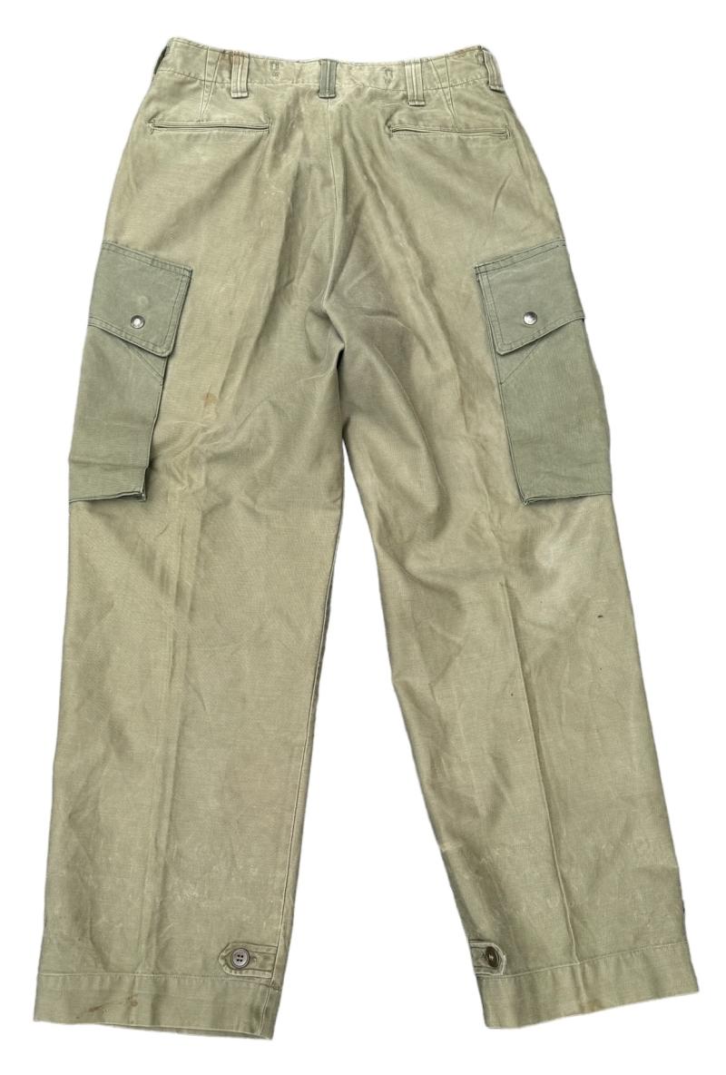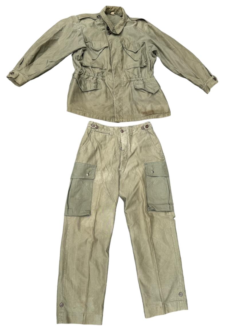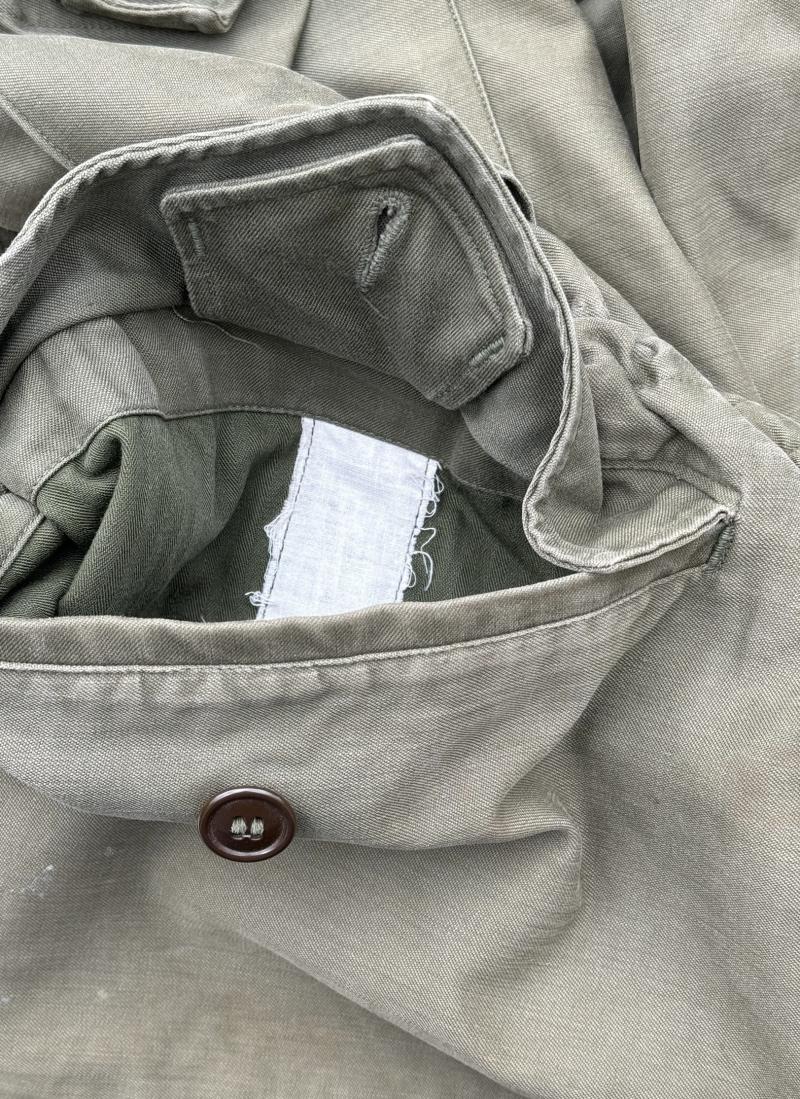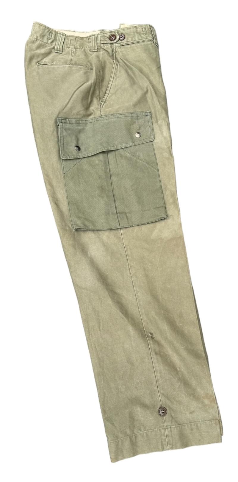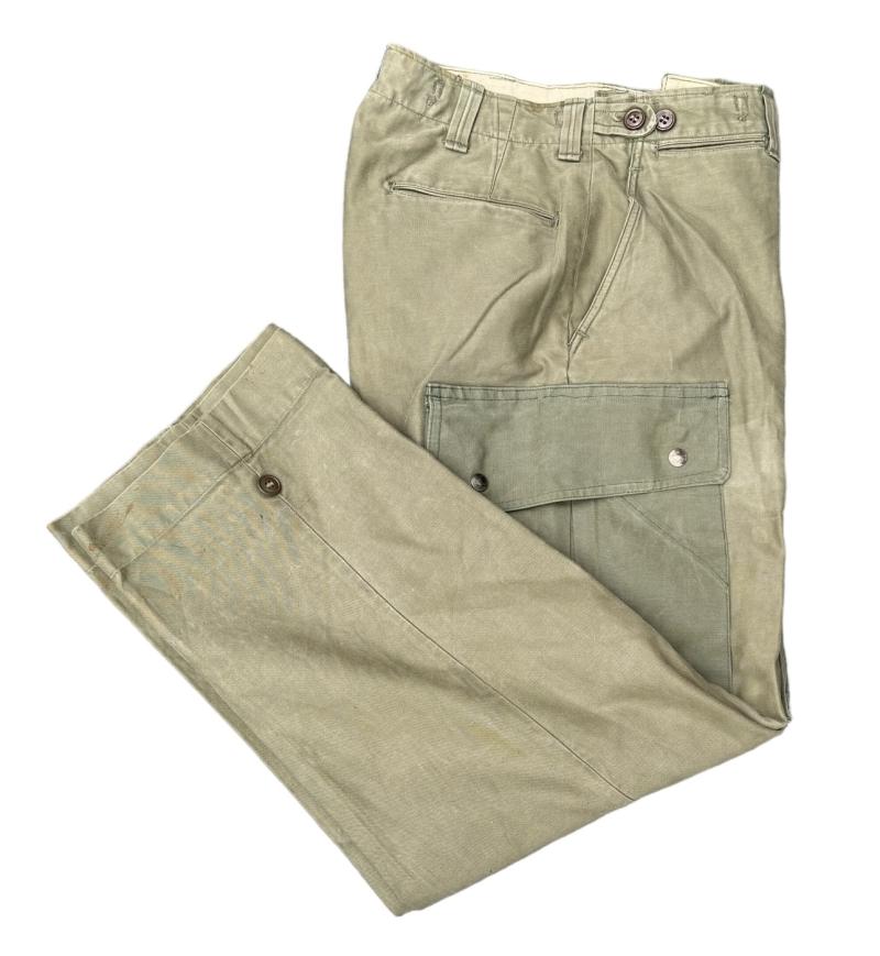 Trousers have Paratrooper pockets ad, but those are ad by(for) a museum or re-enactor and are not original. The jacket and trousers itself are 100% original WW2. Great for a display and the trousers are a nice alternative for hard to find and very expensive Paratrooper trousers. Overal in used but good condition.