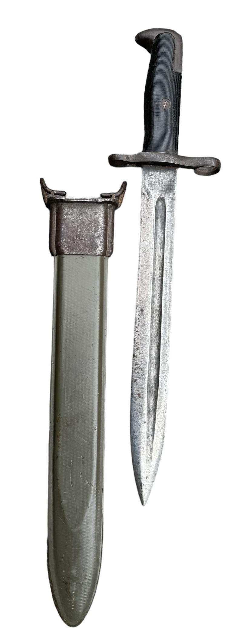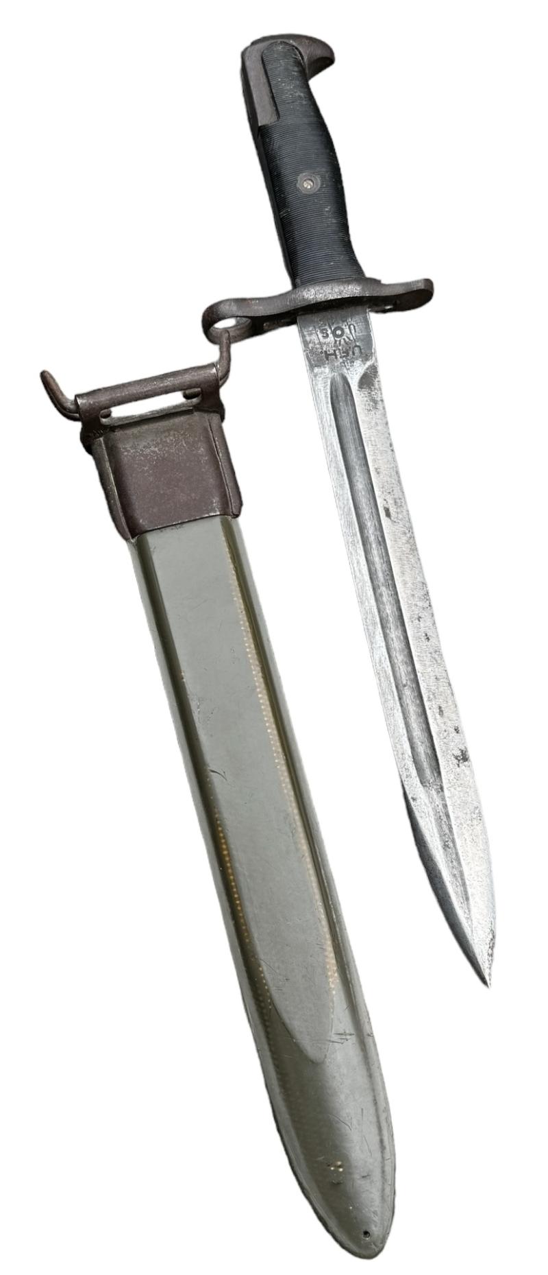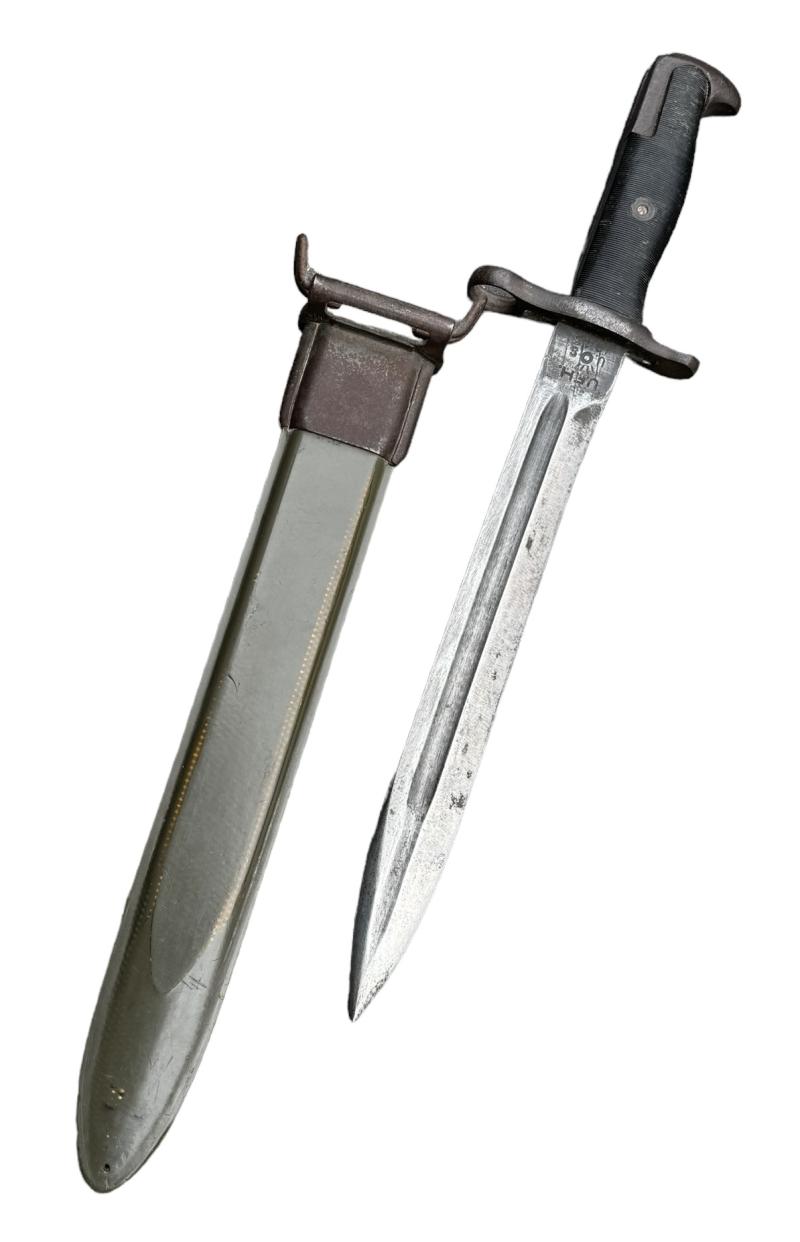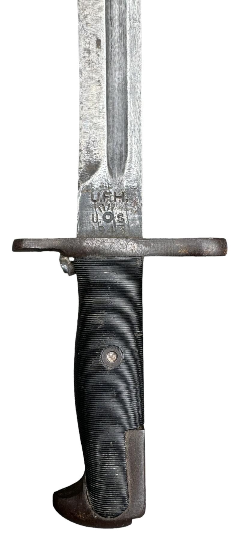 Very nice used US WW2 Garand bayonet in its original scabbard marked with the “flaming” bomb proof sign. The Bayonet is marked “U.F.H.” and dated “1942” also marked with the “flaming” bomb proof sign. This is an official shortened long “Springfield” bayonet. In very nice used condition.