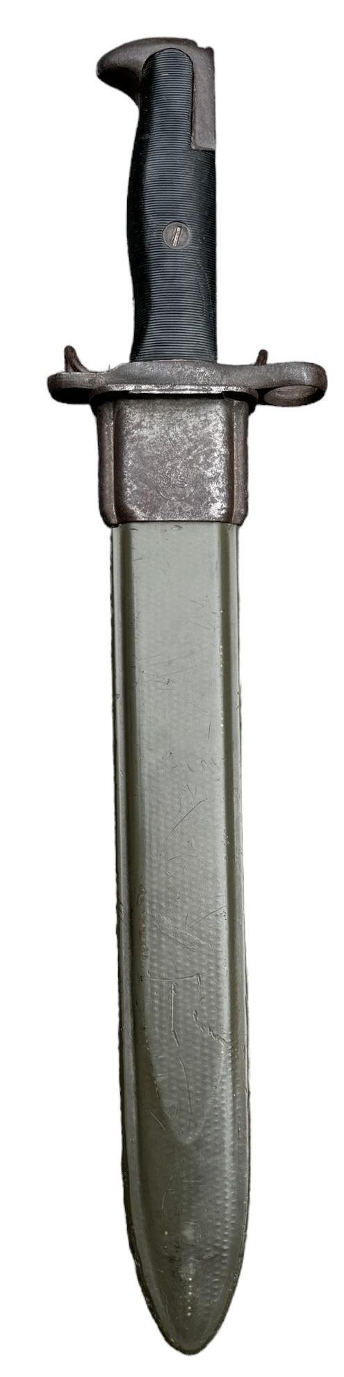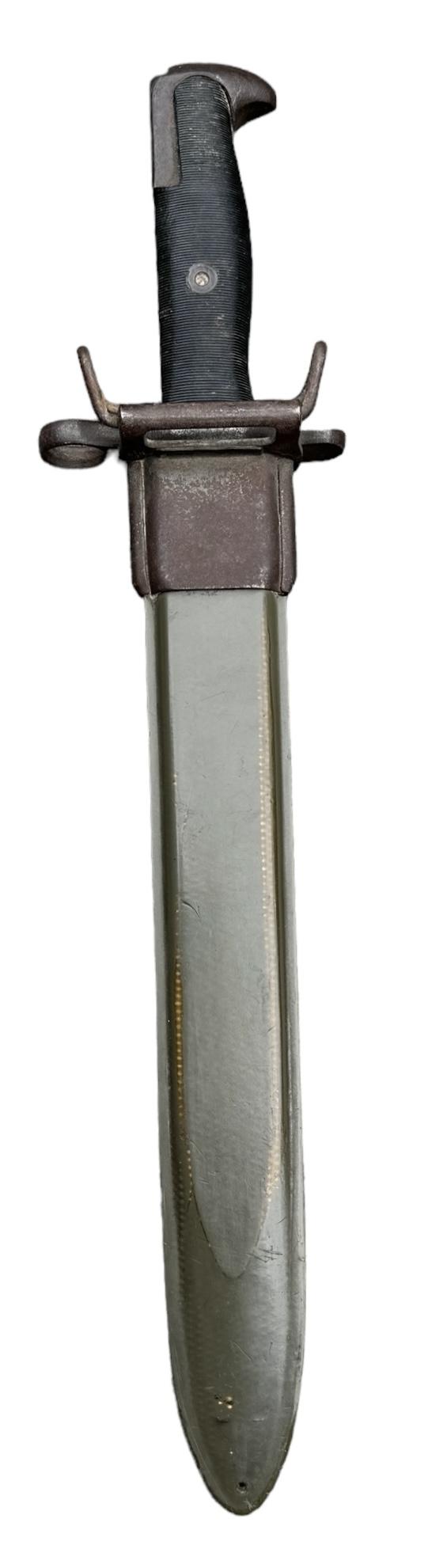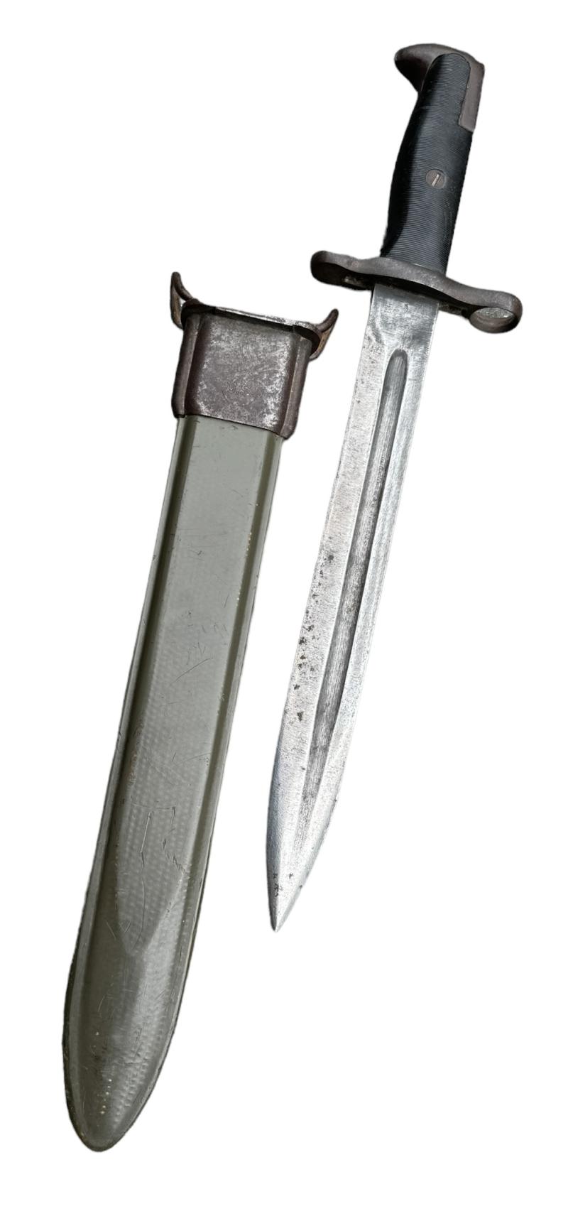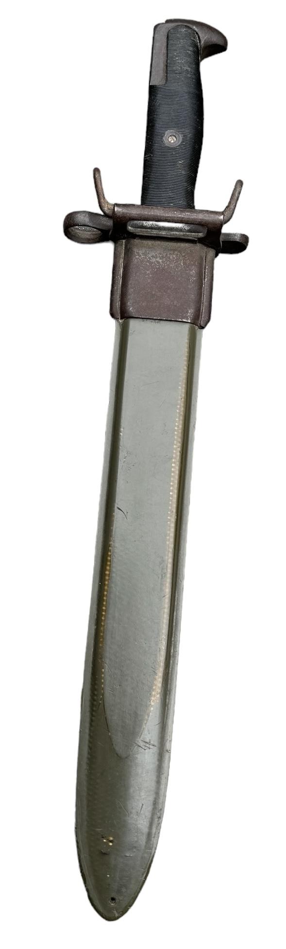 Very nice used US WW2 Garand bayonet in its original scabbard marked with the “flaming” bomb proof sign. The Bayonet is marked “U.F.H.” and dated “1942” also marked with the “flaming” bomb proof sign. This is an official shortened long “Springfield” bayonet. In very nice used condition.