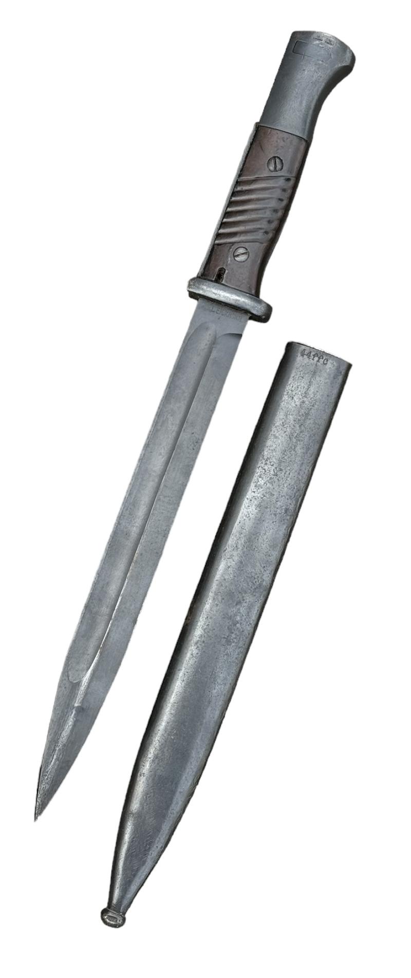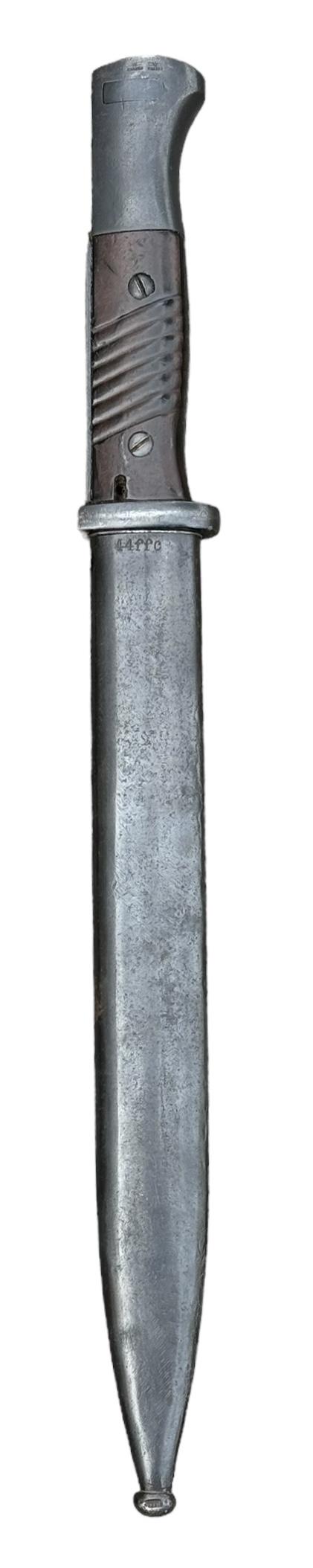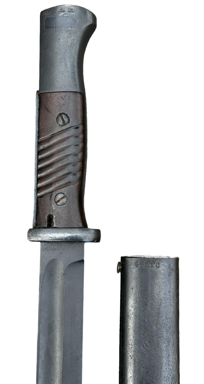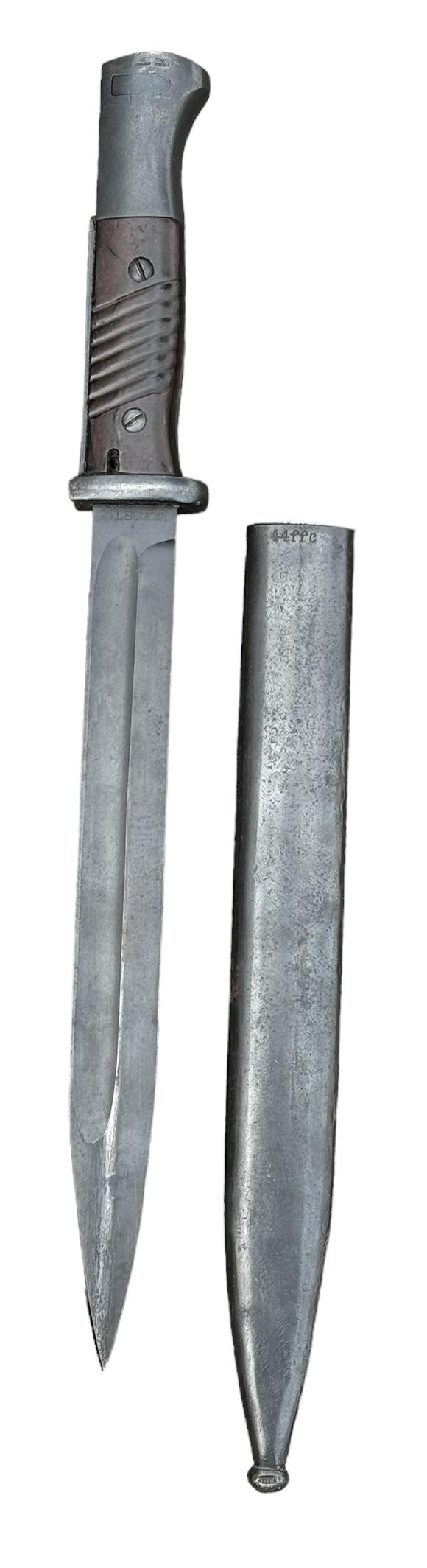 K98 Bayonet Very nice used non matching K98 bayonet. Bayonet maker marked “Eickhorn” the scabbard “FFC” and dated “1944”. Overal a fantastic bayonet in very good condition.