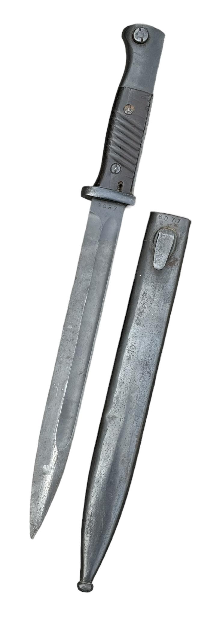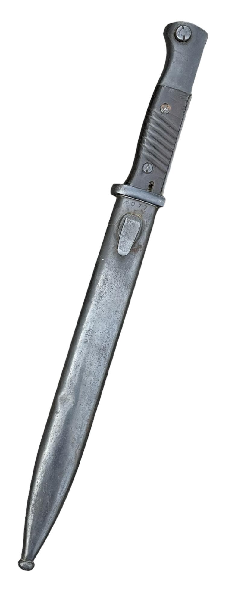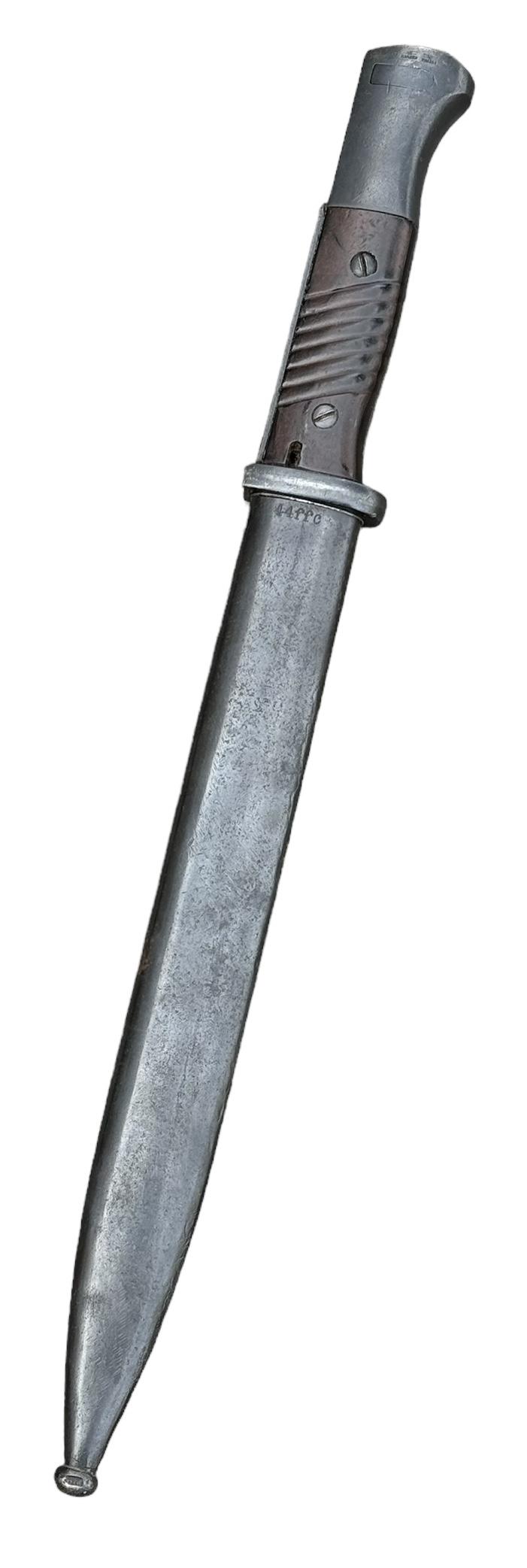 K98 Bayonet Very nice used non matching K98 bayonet. Bayonet maker marked “Eickhorn” the scabbard “FFC” and dated “1944”. Overal a fantastic bayonet in very good condition.