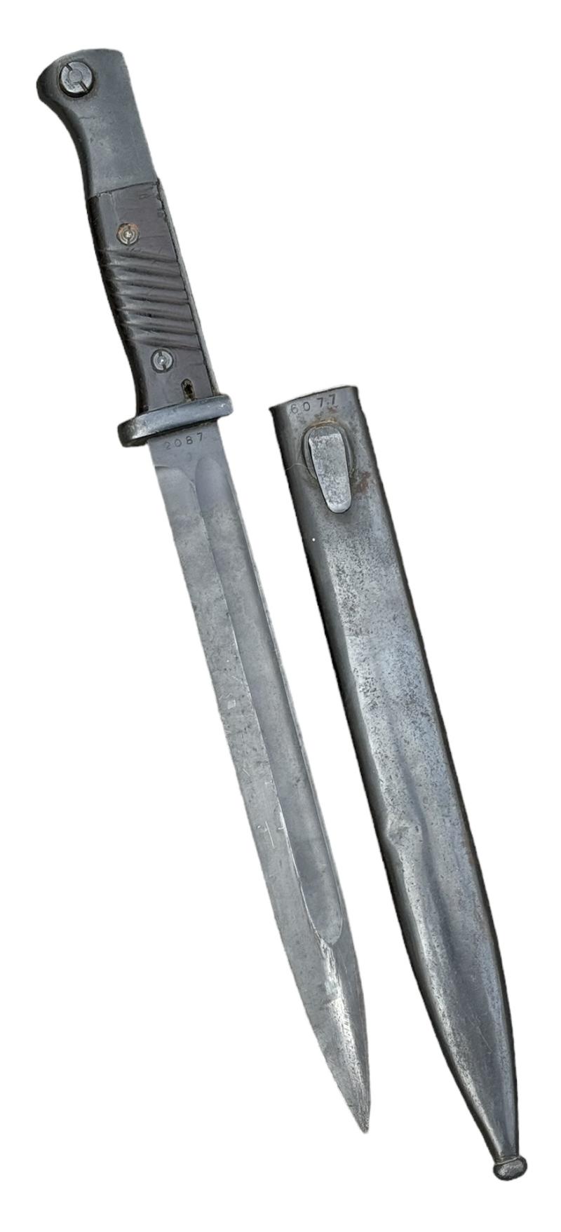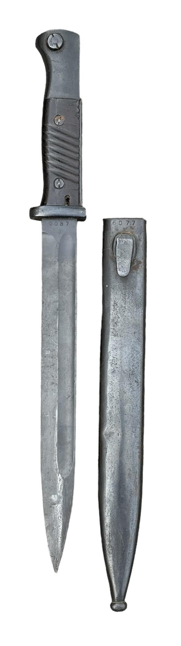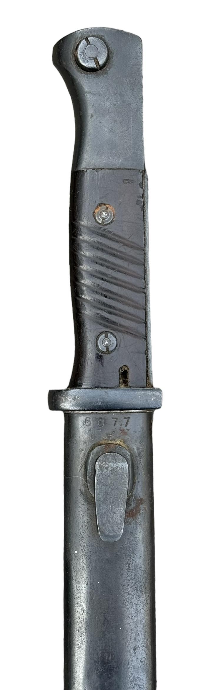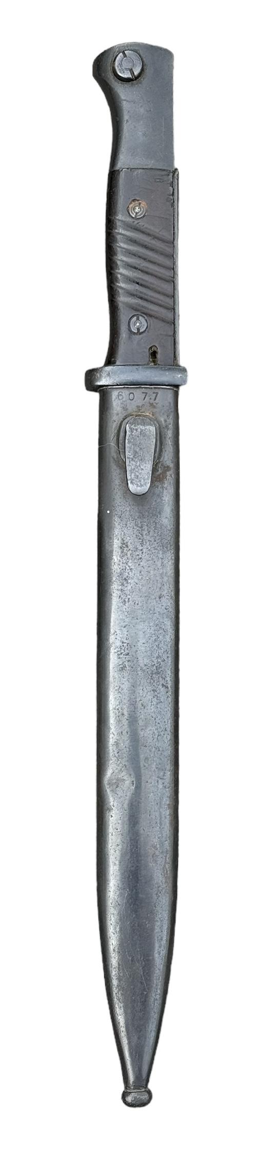 K98 Bayonet Very nice used non matching K98 bayonet. Bayonet maker marked “Eickhorn” the scabbard “FFC” and dated “1944”. Overal a fantastic bayonet in very good condition.