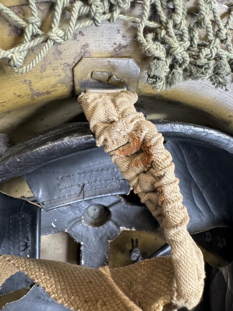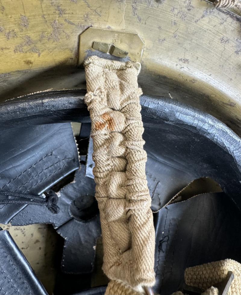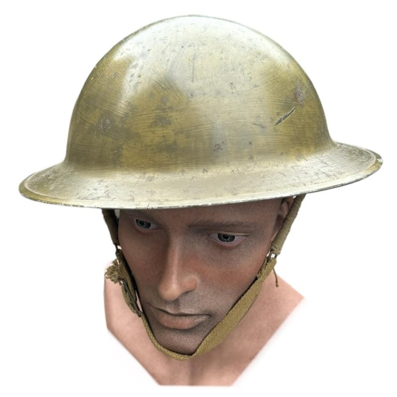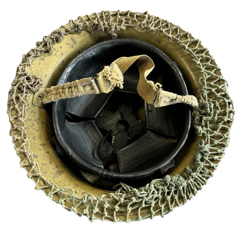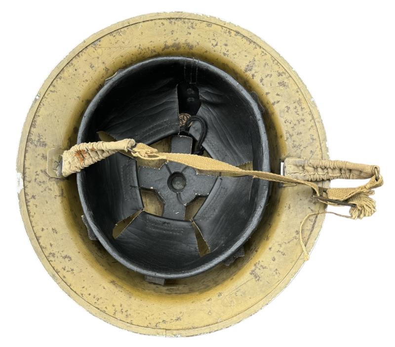 Rare early British WW2 “Brodie” helmet with so-called cotter pins to attach the helmet strap attachment pieces. Helmet comes with the early liner and helmet strap and in original Tropical/Dessert camo paint.