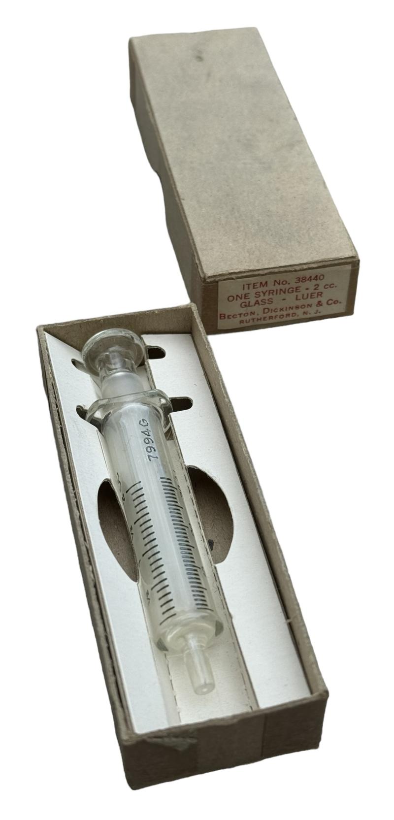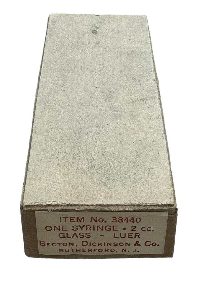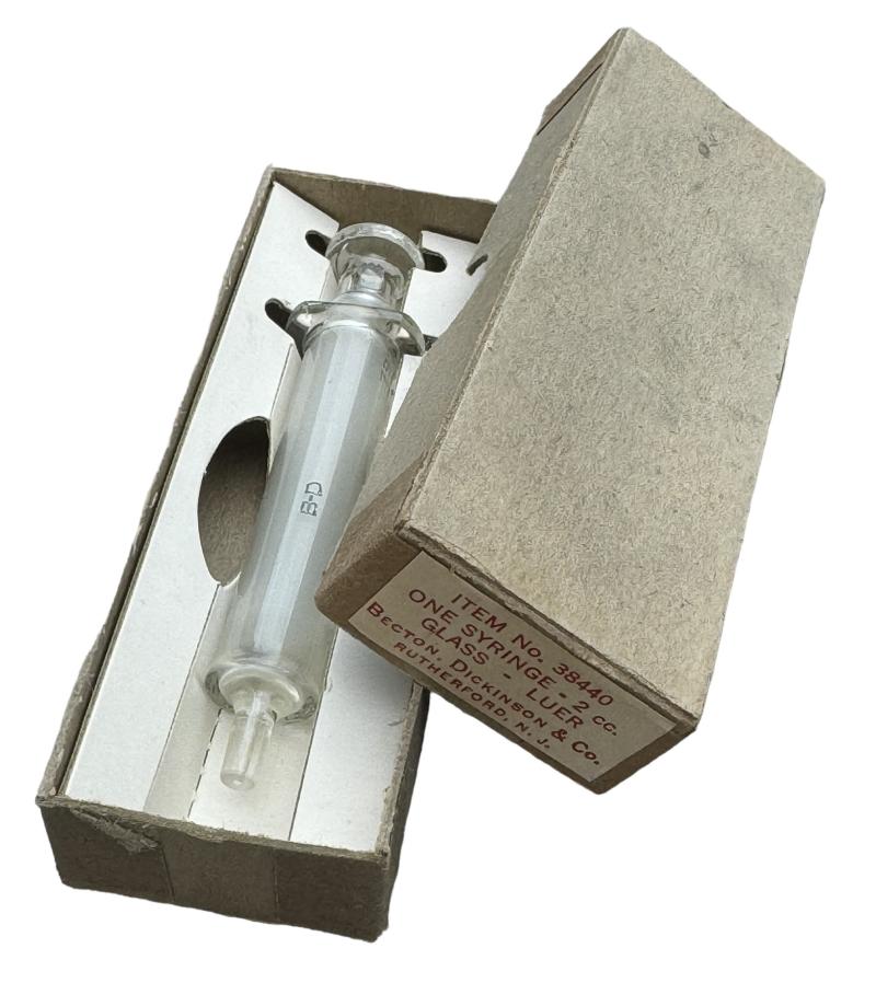 US WW2 Medical Syringe in original clipboard Box Mint condition US WW2 medical syringe made of glas in original clipboard box with original paper label.