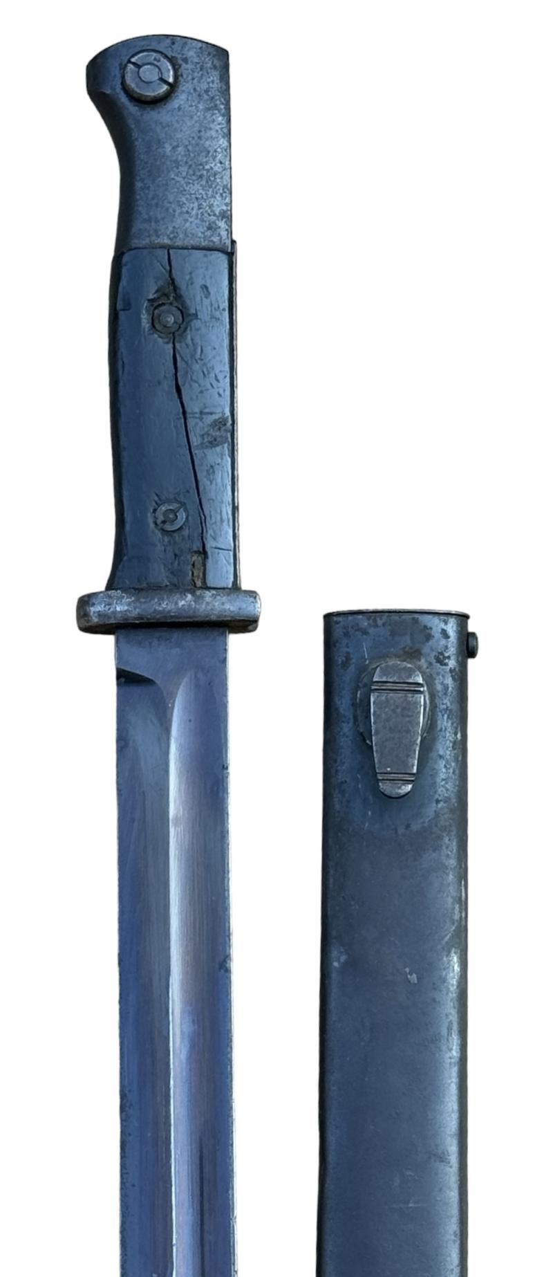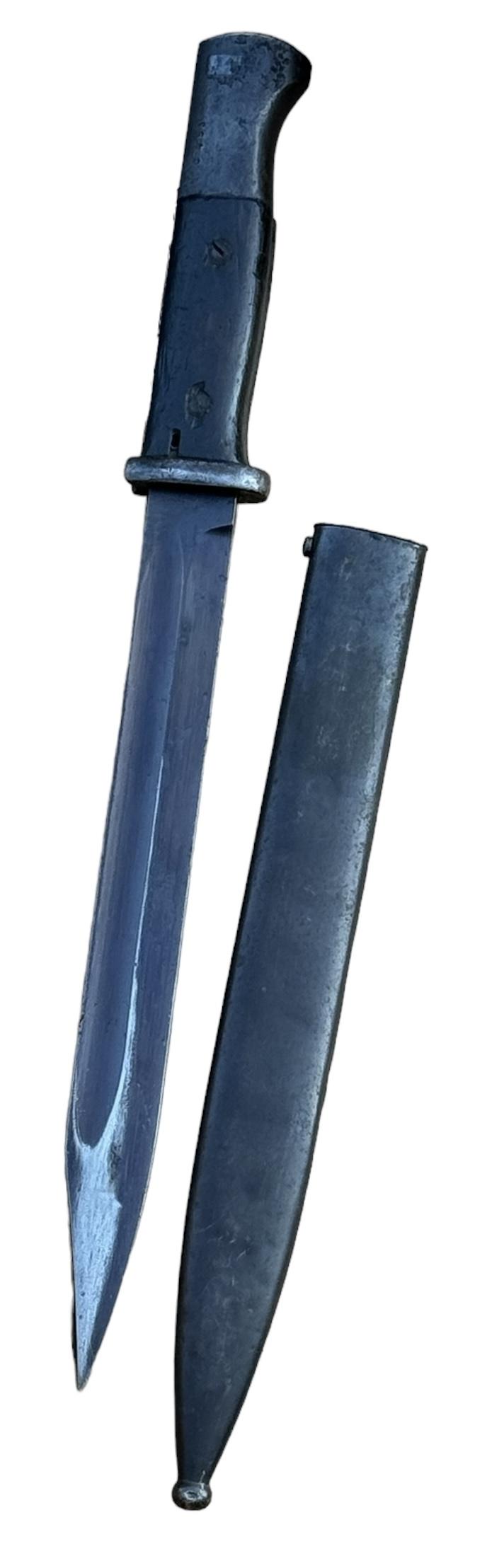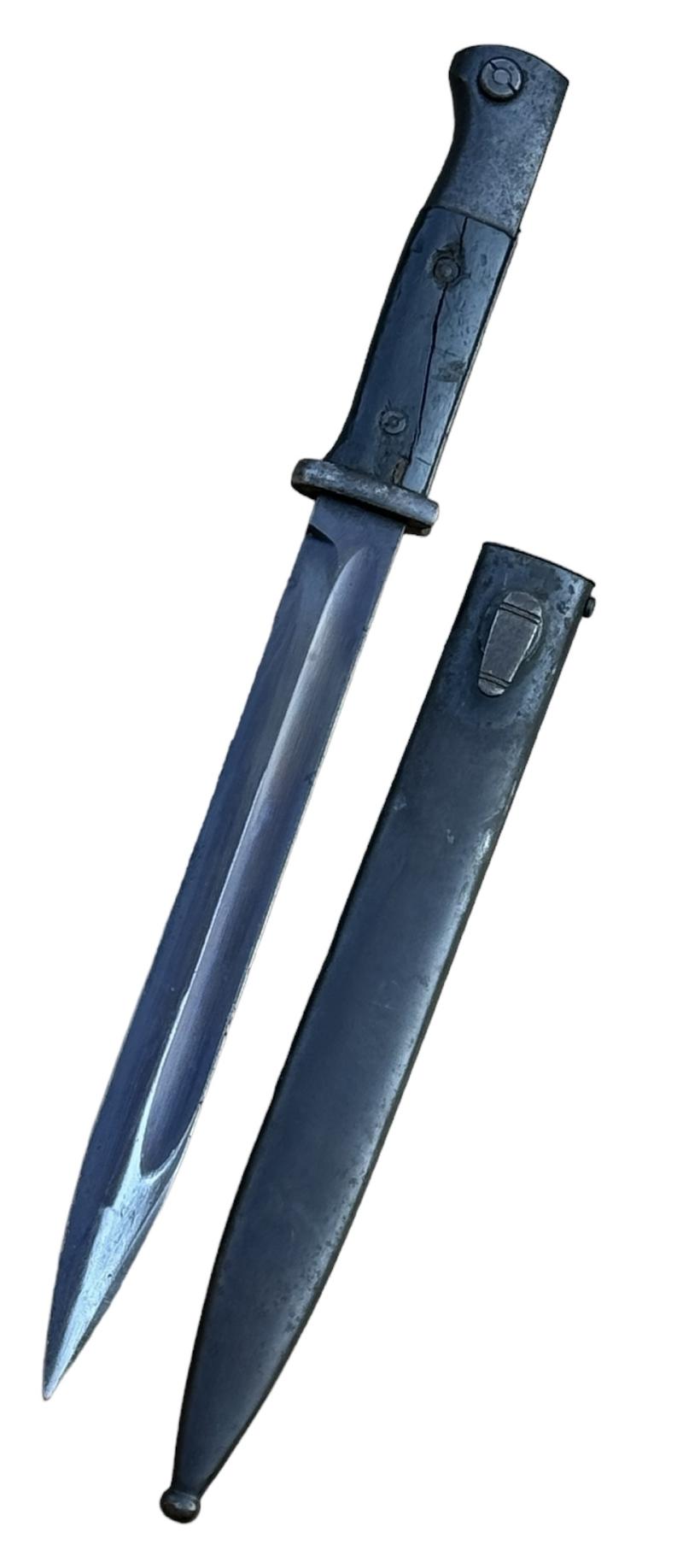 K98 Bayonet Used commercial K98 bayonet with wooden grip. In its original steel scabbard. In used but good condition.