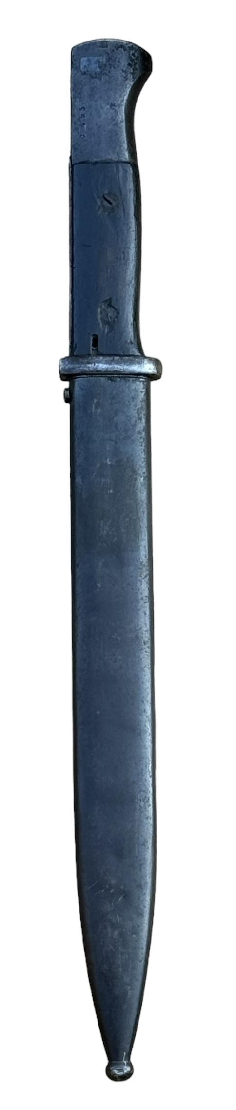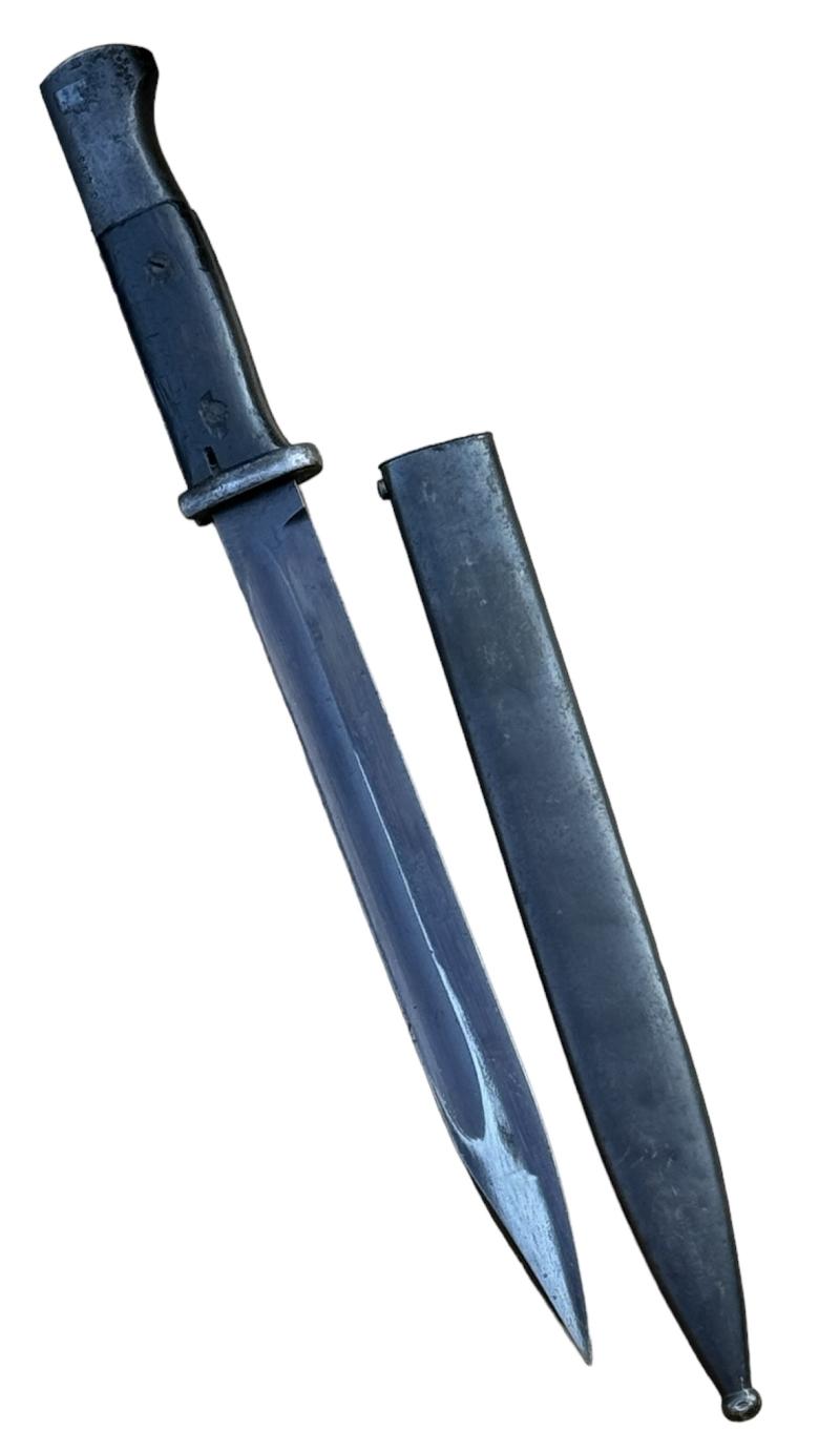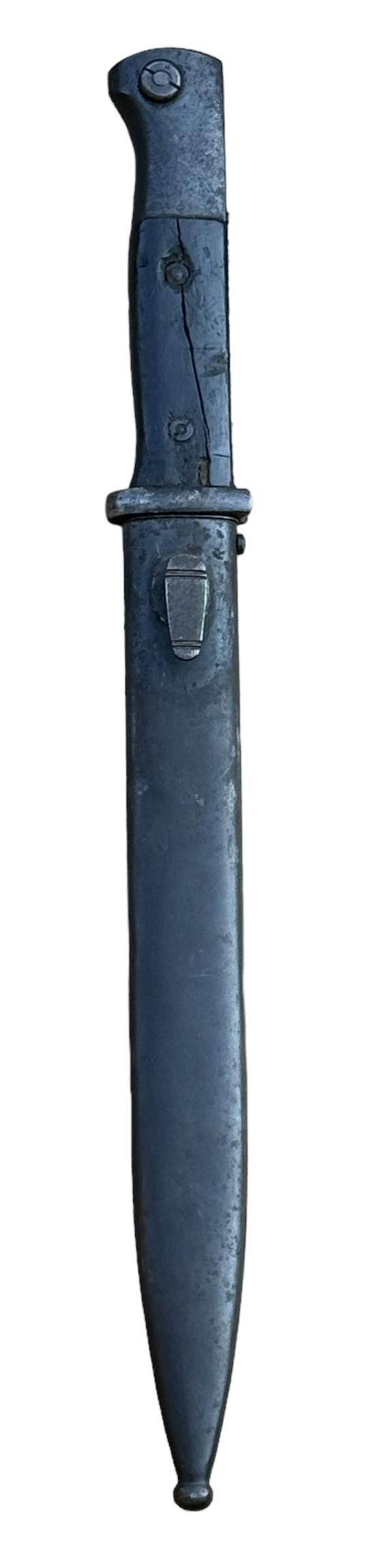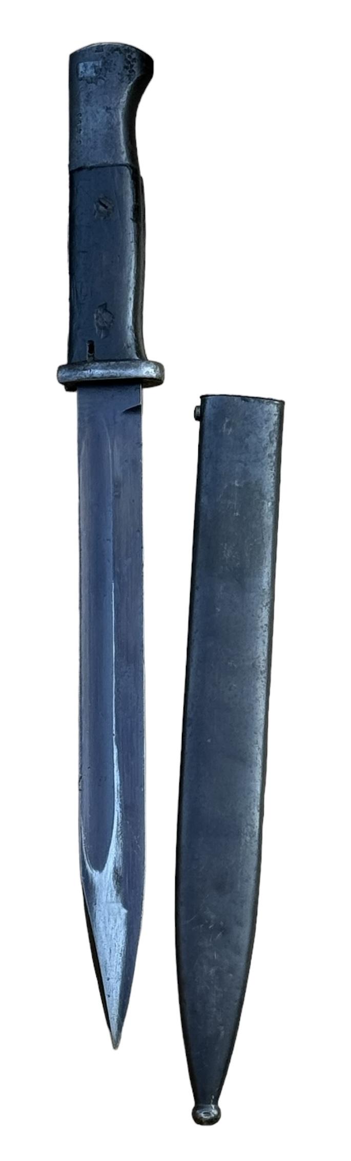 K98 Bayonet Used commercial K98 bayonet with wooden grip. In its original steel scabbard. In used but good condition.