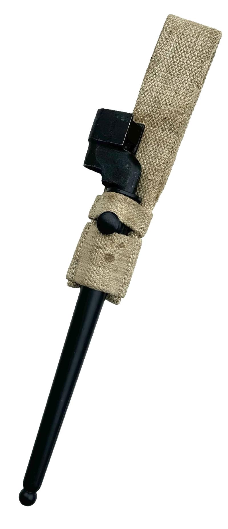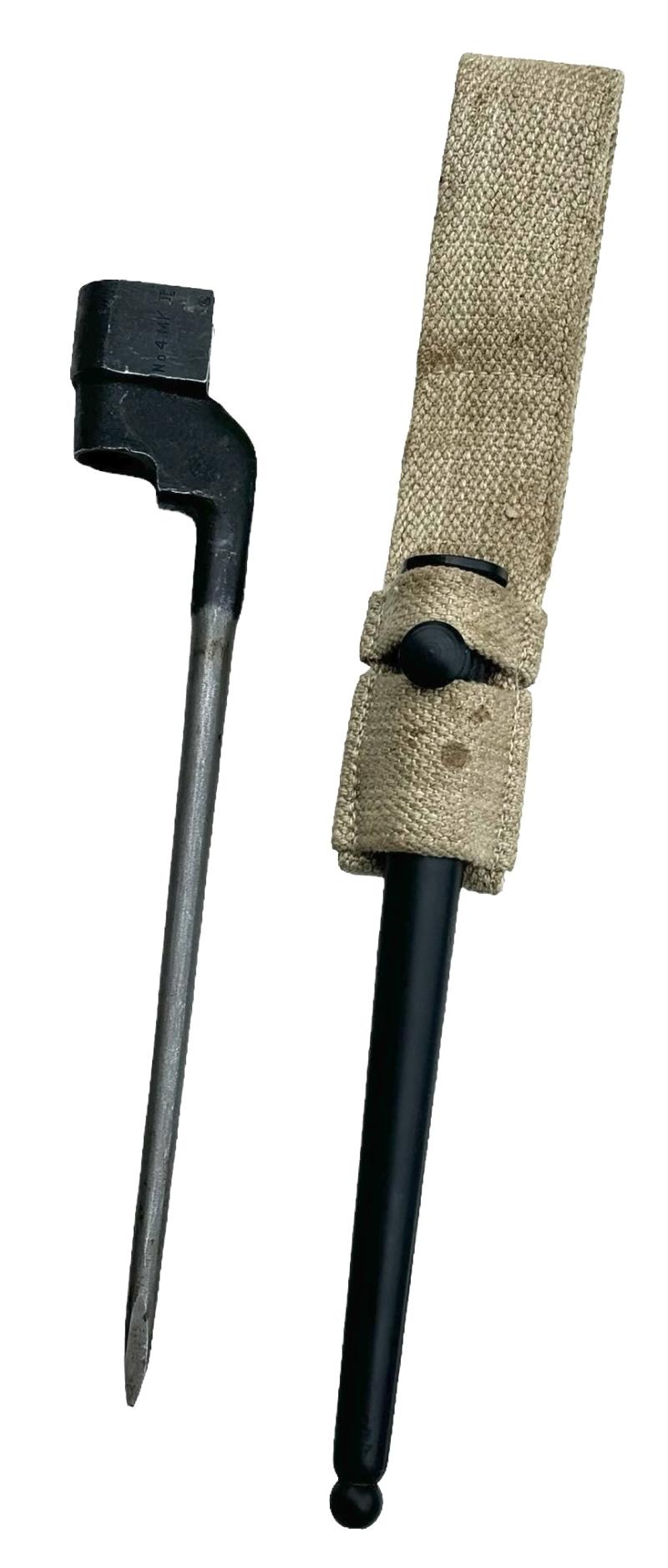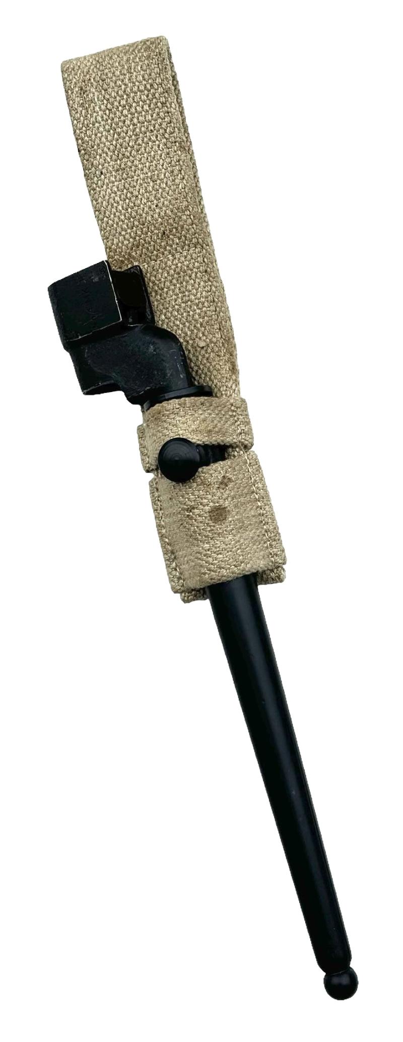 British WW2 Spike Bayonet with Frog Very nice near mint British WW2 Number 4 MK2 spike bayonet with webbing frog In very good near mint condition.