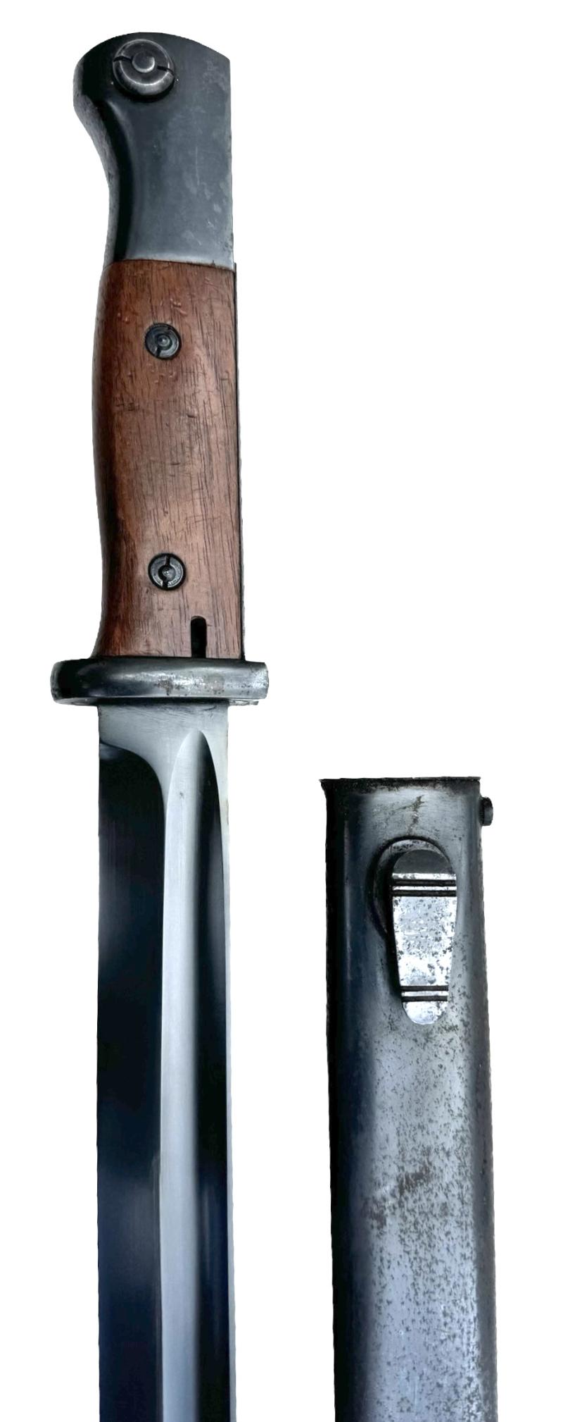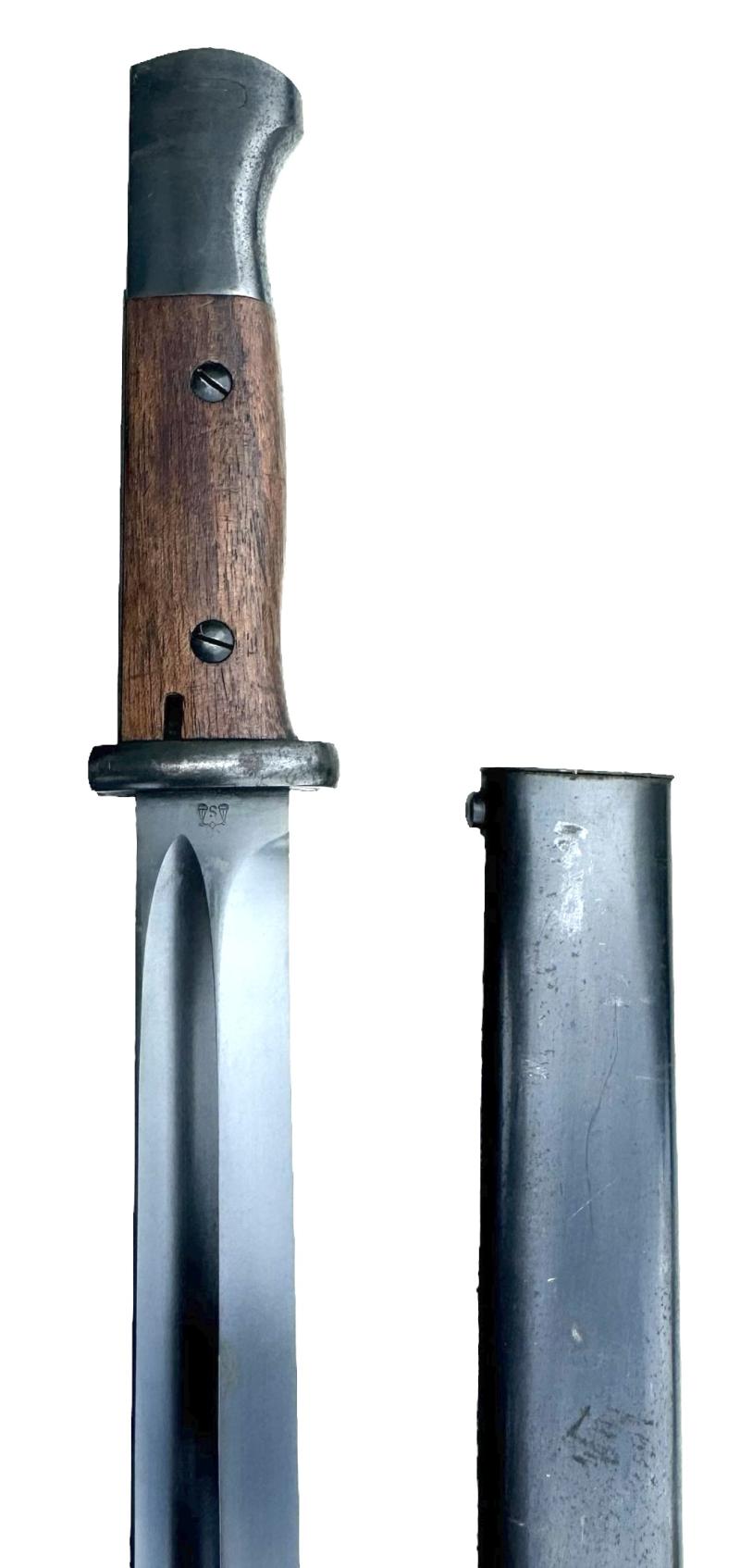 With early style wooden grips. Overal a nice used bayonet in good condition.