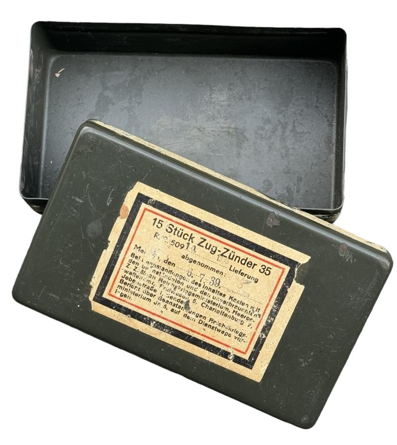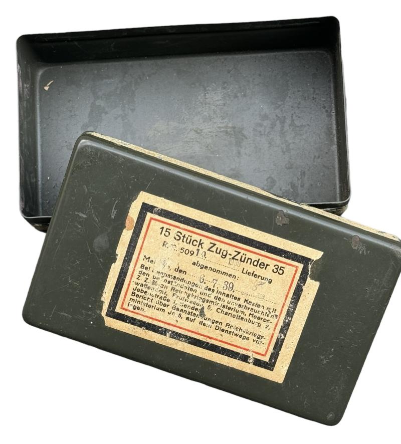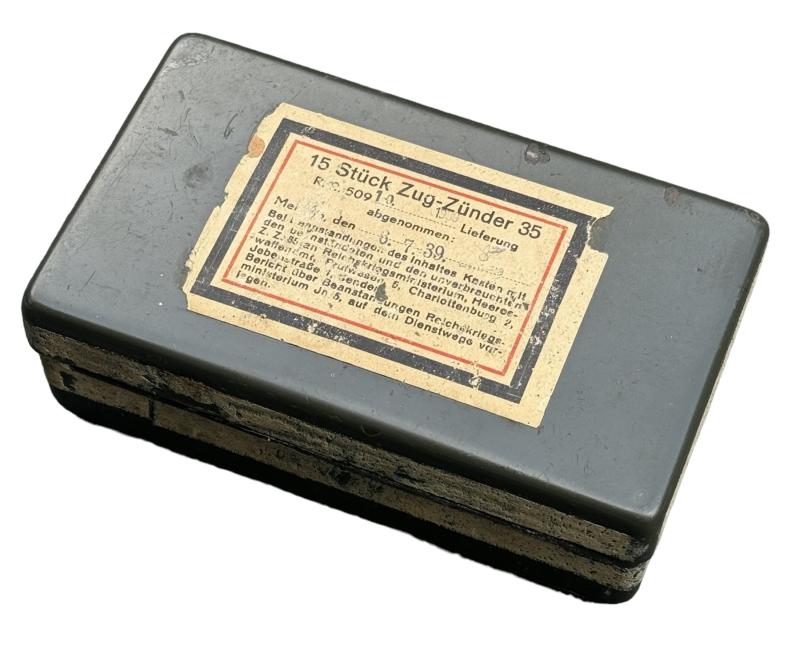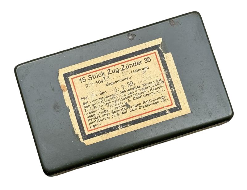 Very nice metal case for 15 pull fuses for the S mine 35 (Bouncing Betty), with its original label.