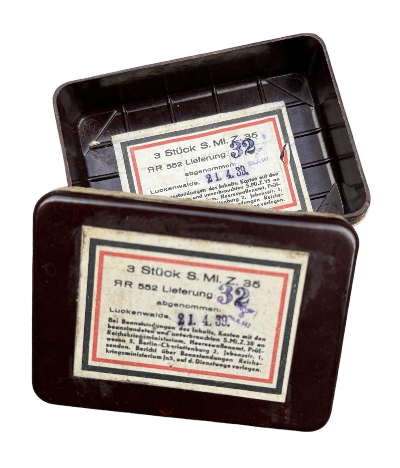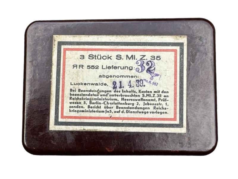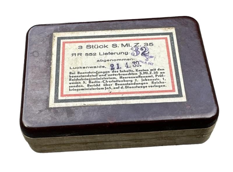 Very nice bakelite case for 3 fuses for the S mine Z 35 (Bouncing Betty), with its original label.