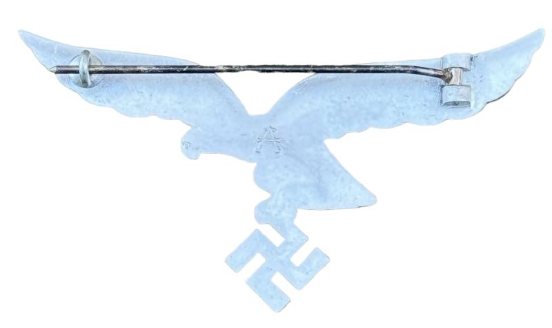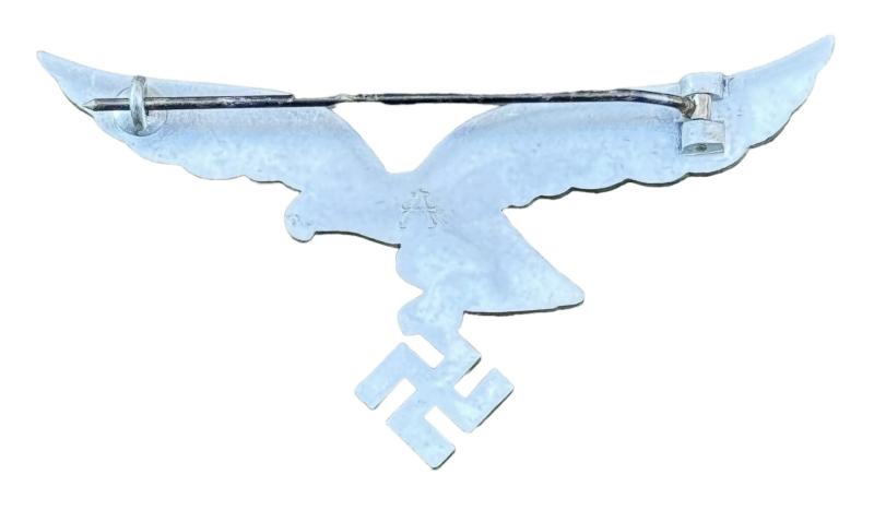 Very nice aluminum made Luftwaffe summer tunic breast eagle. Nicely maker marked “A” which is “Aschmann”. In outstanding condition!