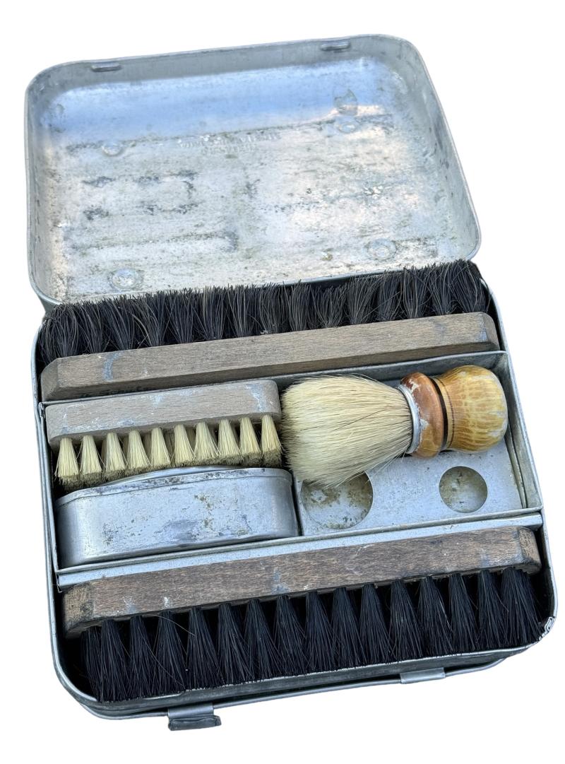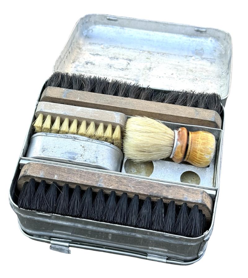 Very nice light weight (aluminium) Wehrmacht cleaning/polish box from "Mica" nicely "D.R. Patent" marked. The "Mica" box fits like a glove in the M31 Wehrmacht mestin. with original brushes.