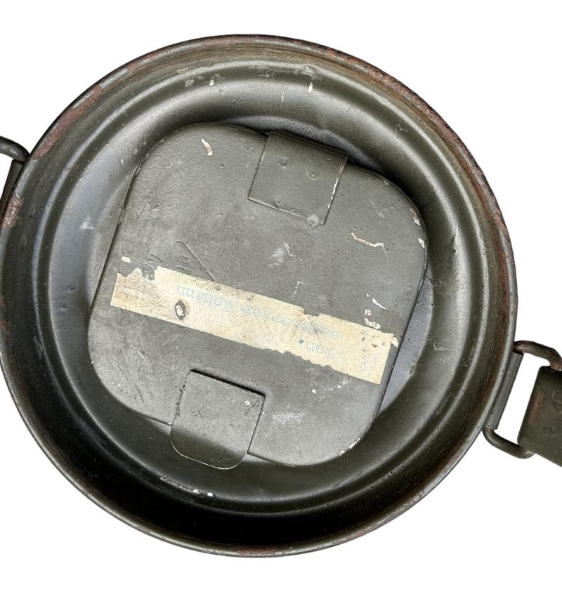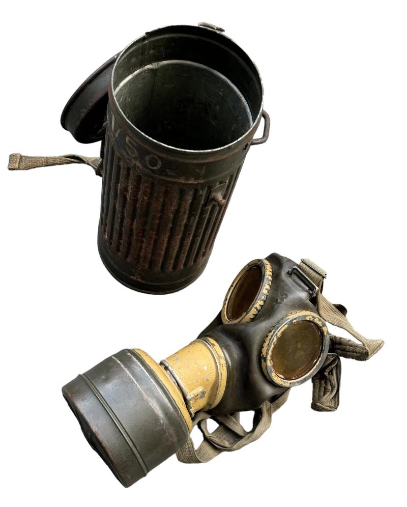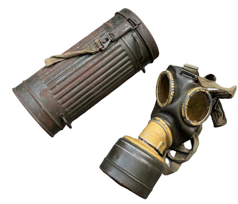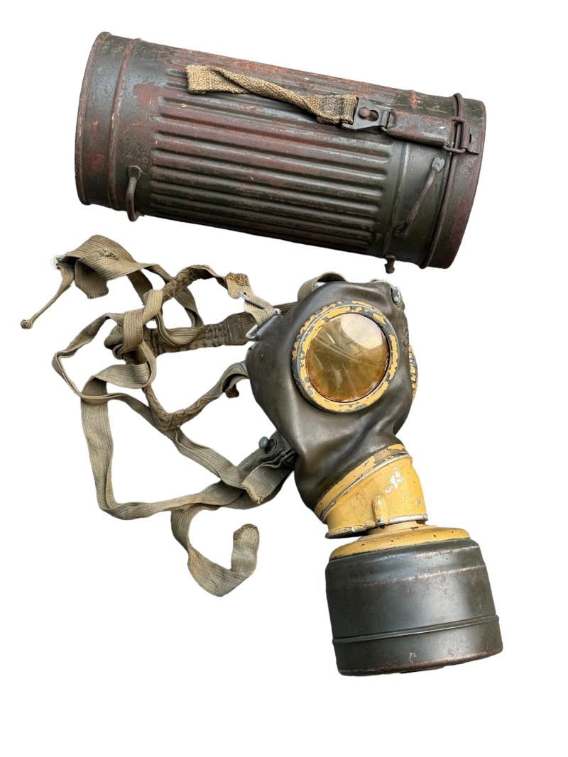 Nice used Wehrmacht M31 gasmask en M31 gasmask cannister. In 90% of its original field/gray camo paint. Cannister straps are missing but are often for sale. Overal a nice used Wehrmacht M31 gasmask and cannister in used but good condition.