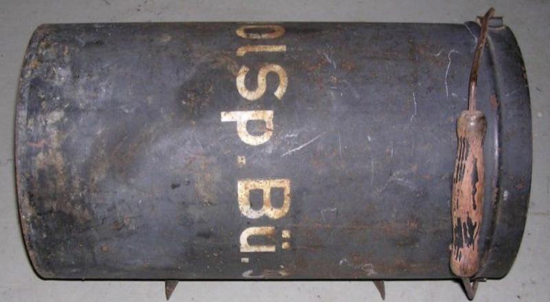 The wooden case holts 4, 10 liter containers “Sprühbüchse” (Mines) Overal a very nice wooden case with original text on top. Great for a nice ammunition case collection!