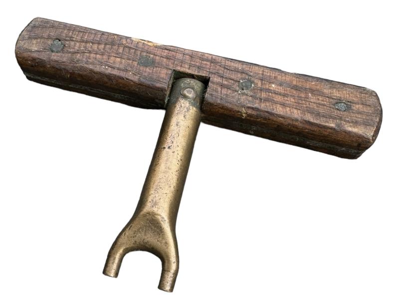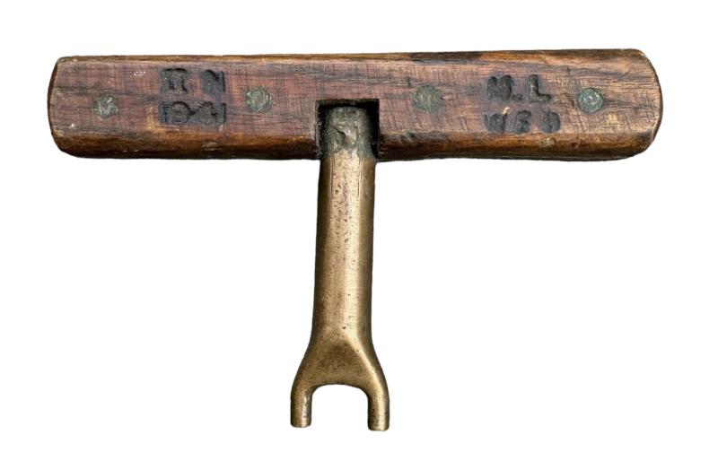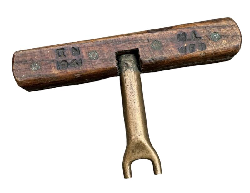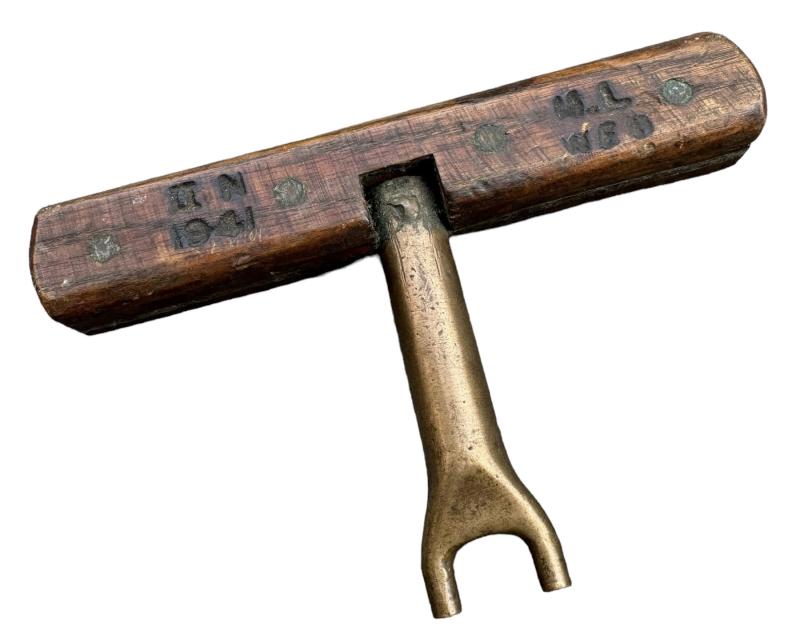 British WW2 Mills Bomb Key Nice used brass/wood made British WW2 “Mills Bomb” (hand grenades) key for opening the grenades botom plate. Dated “1941” innused but good condition.