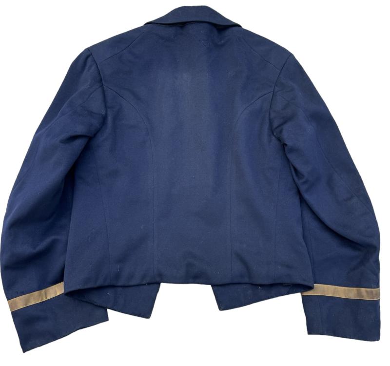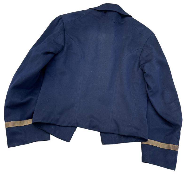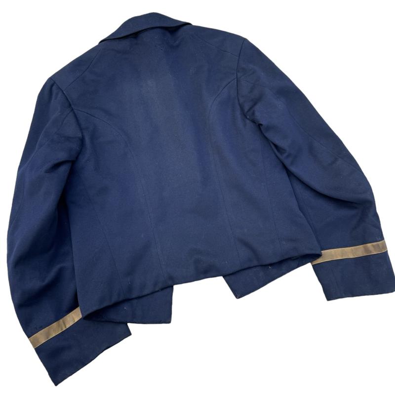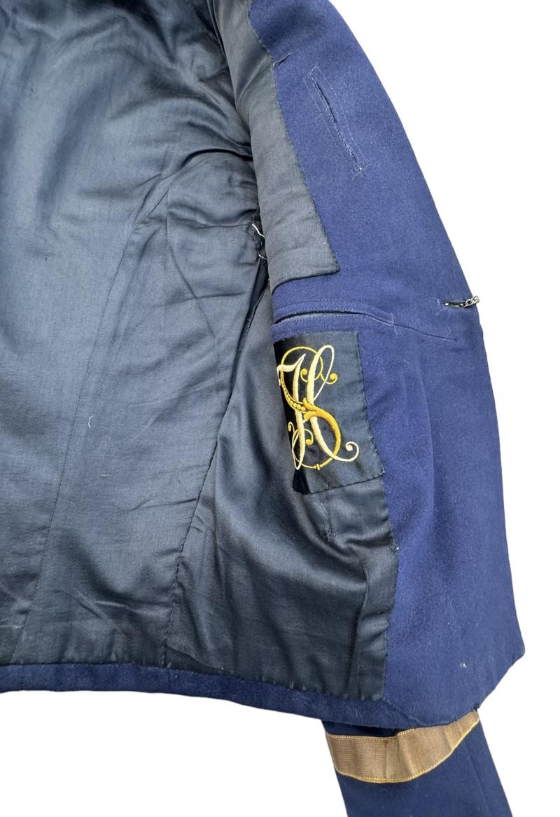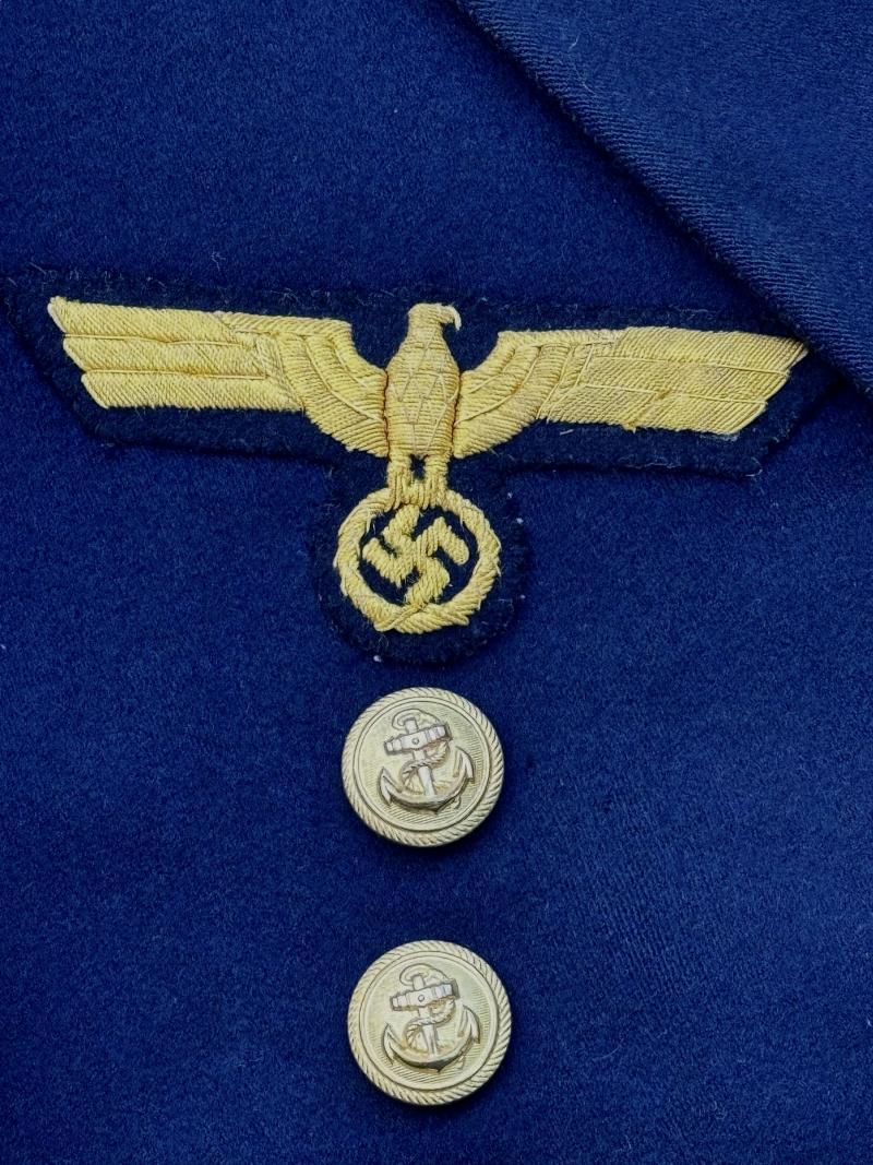 The dark navy-blue wool construction parade jacket is complete with all gold toned Kriegsmarine buttons. The jacket was designed to remain open with a retaining, shackle chain, with dual buttons, worn through the top button eyelets. The jacket is complete with a nicely hand-embroidered breast eagle. A nice gold-toned metal and insignia Nice original Kriegsmarine Parade Jacket in very good condition!