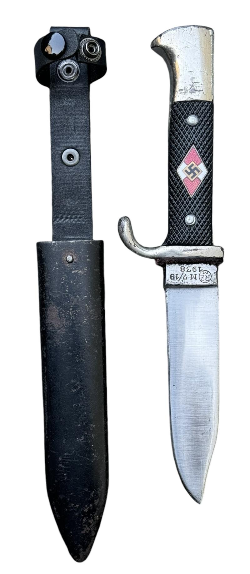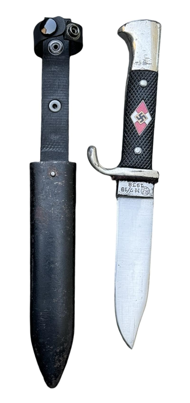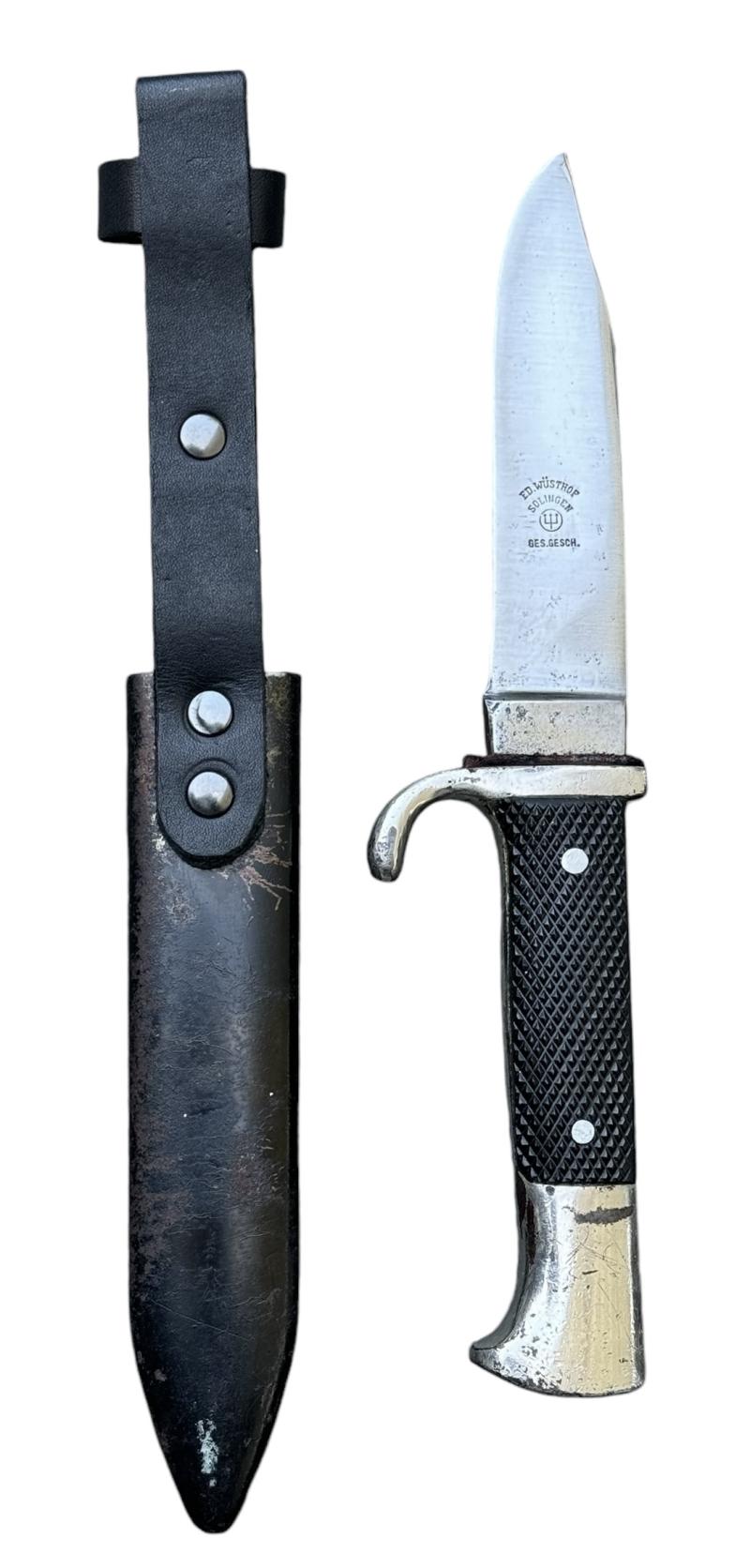Nice used second model Hitler-Jugend dagger in its original metal scabbard (leather replaced).