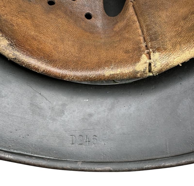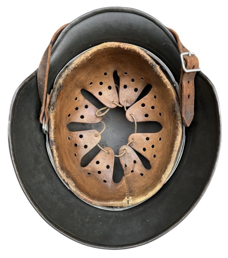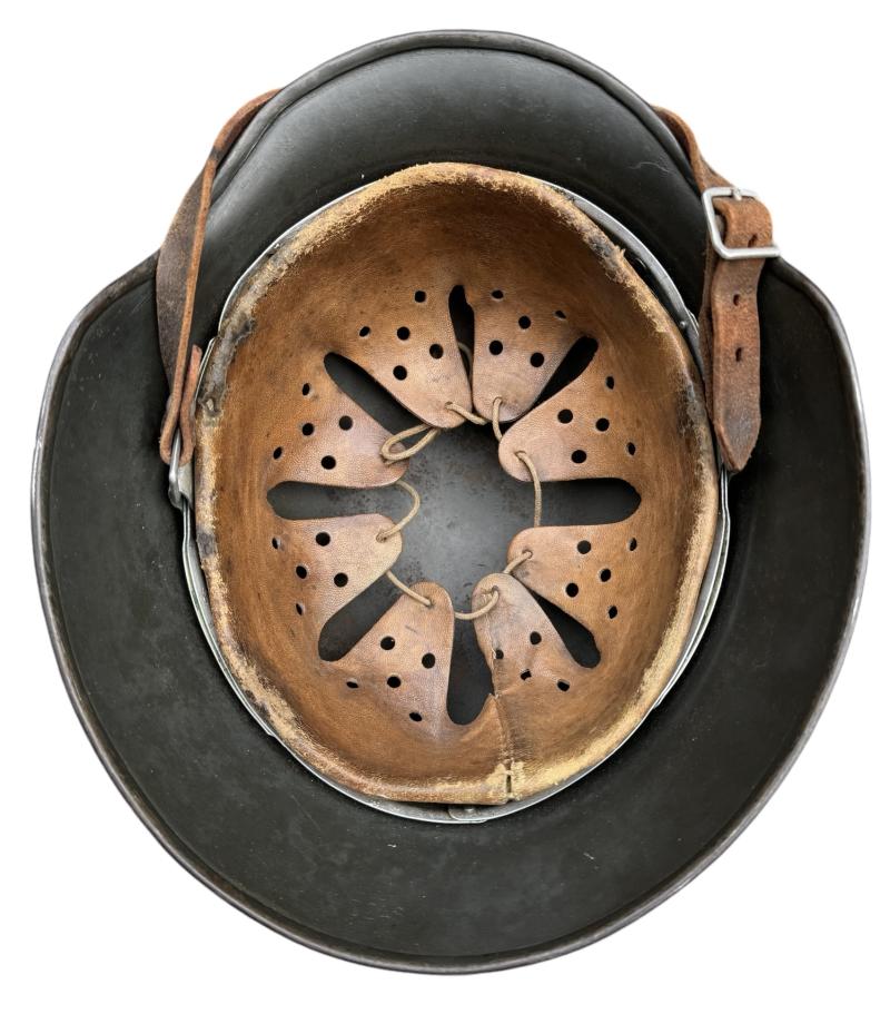 With its second type (re-enfored ring) aluminum liner in size “55”. Complete with its leather helmet strap with steel buckle.