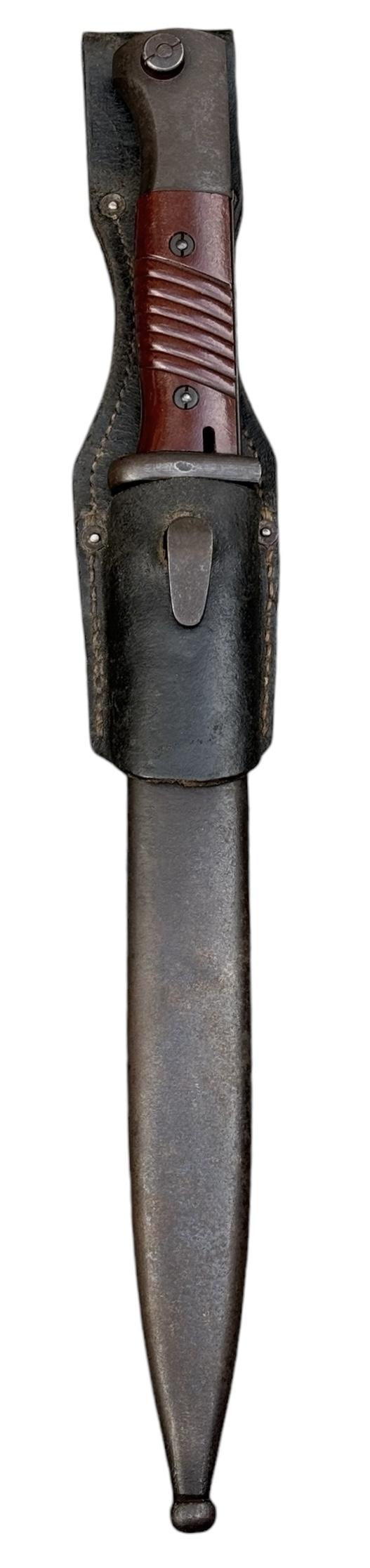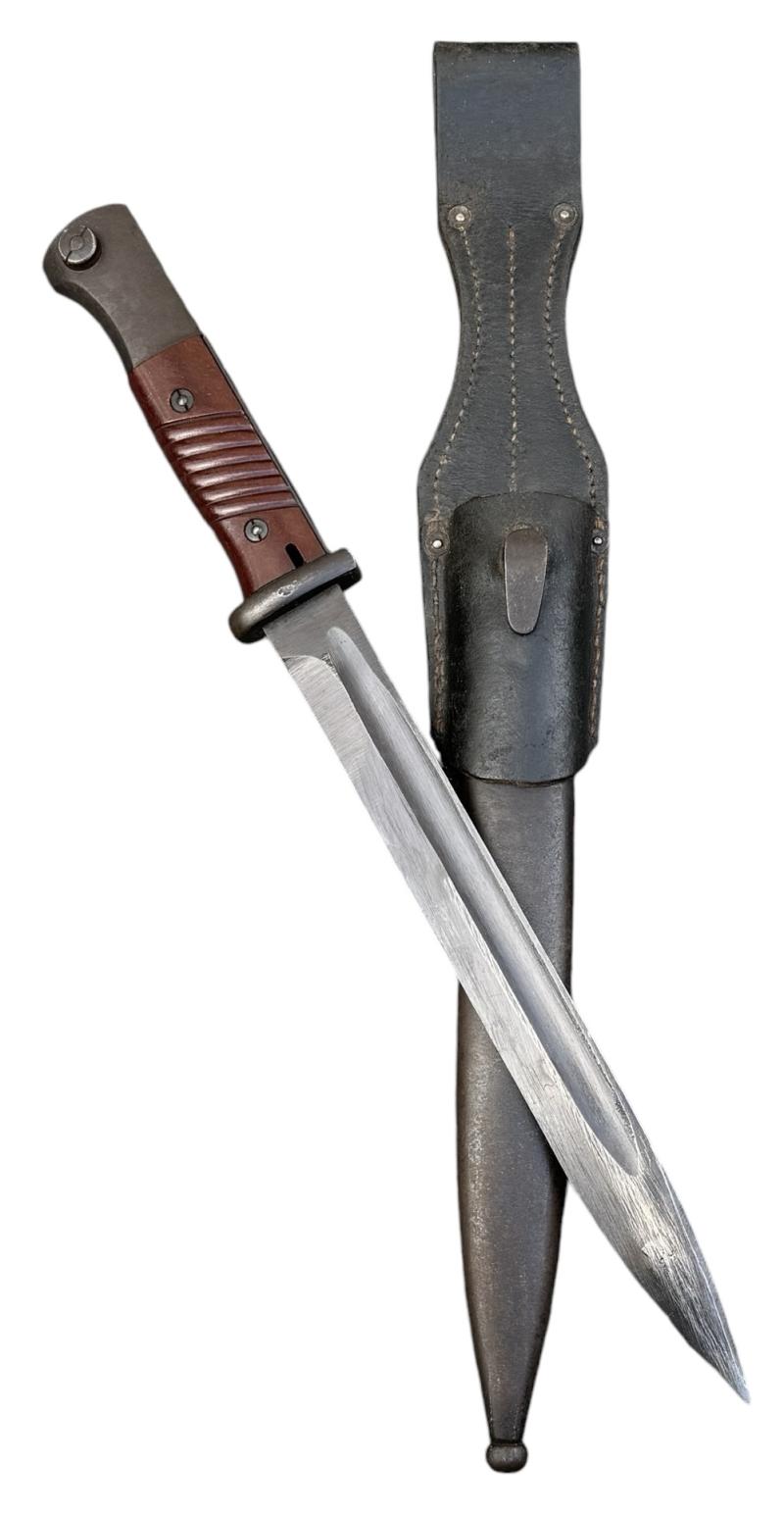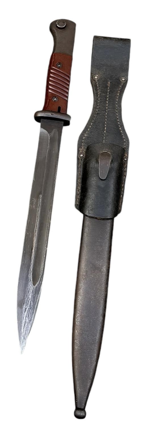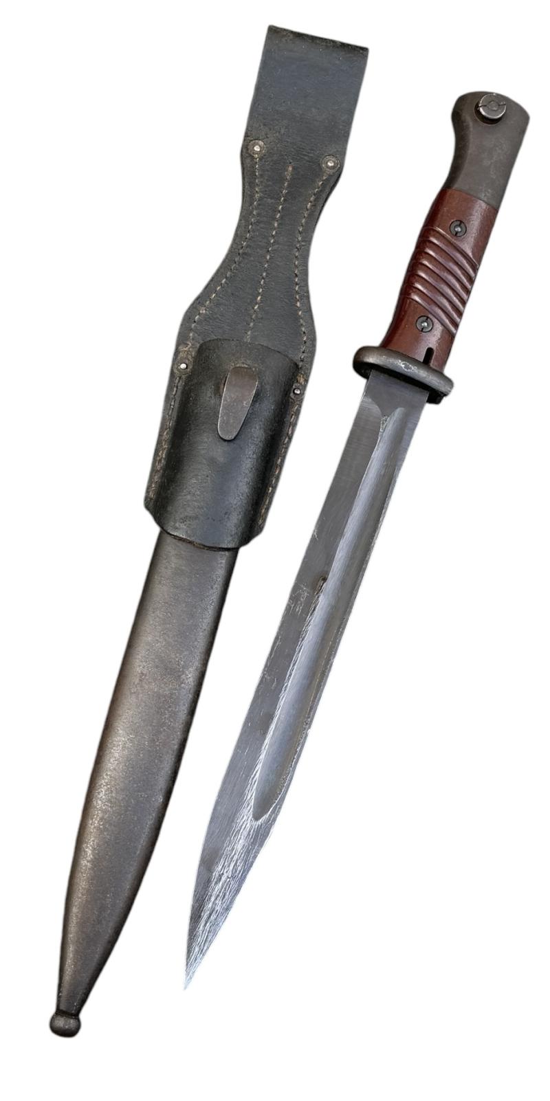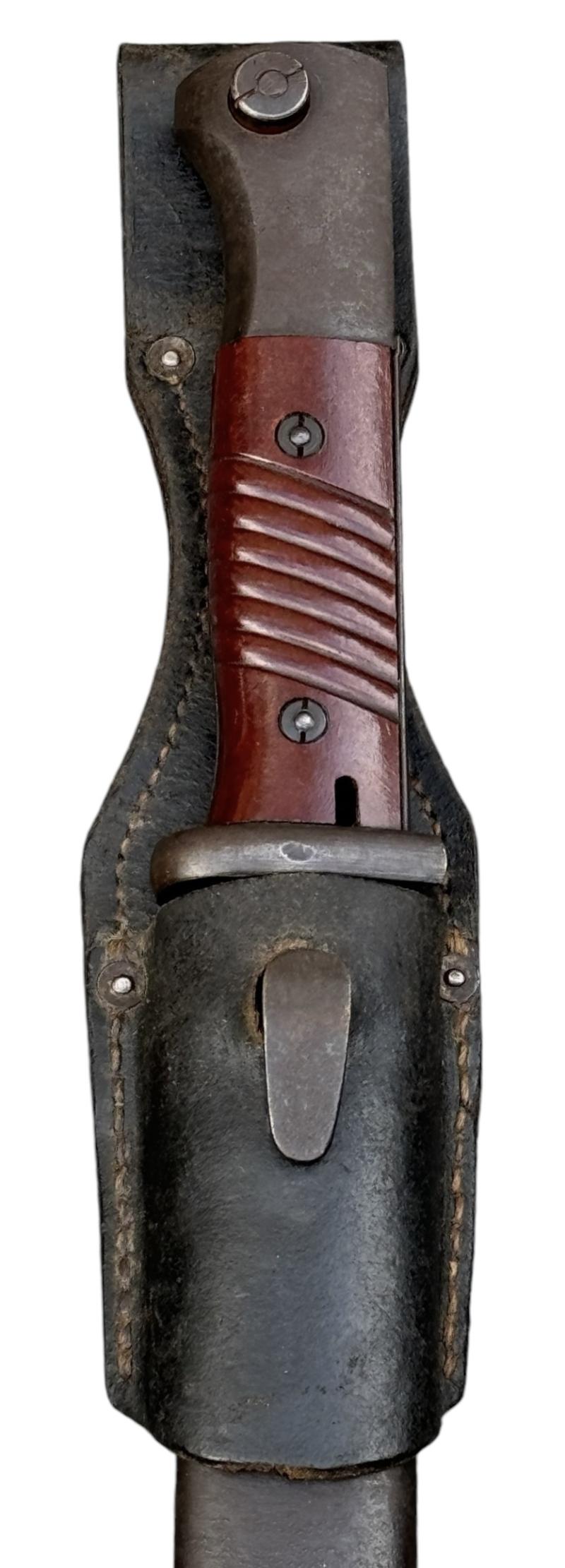 so-called commercial made. In its original metal scabbard. And “RBN” number marked leather bayonet frog. Overal a very nice bayonet in used but in very good condition! Great to complete Wehrmacht combat gear! Or in a bayonet collection!