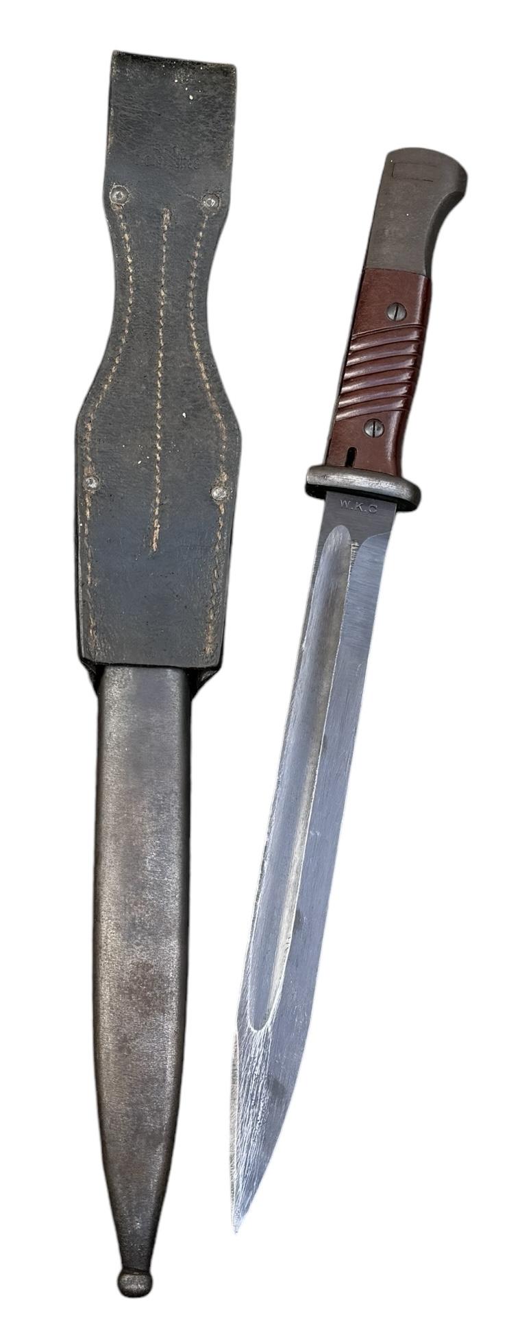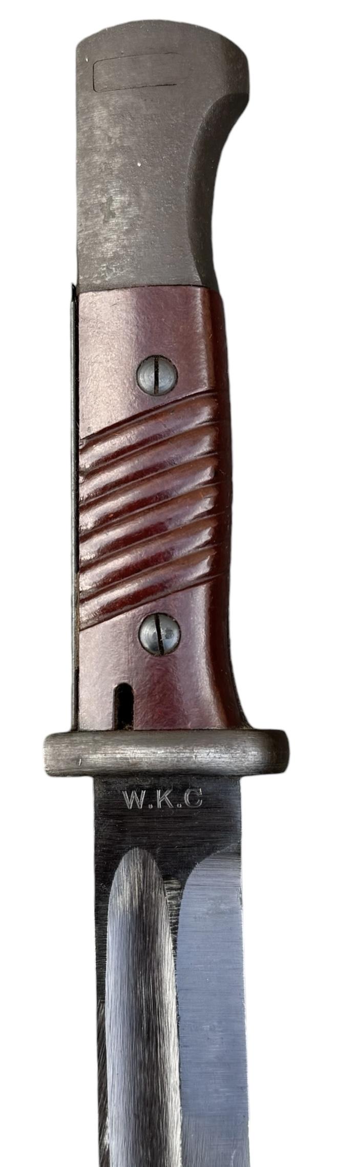 Very nice late war made K98 bayonet with light brown Bakelite grips. Made by “WKC” but non numbered.
