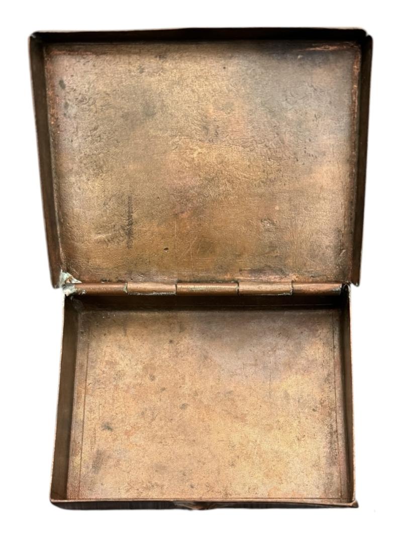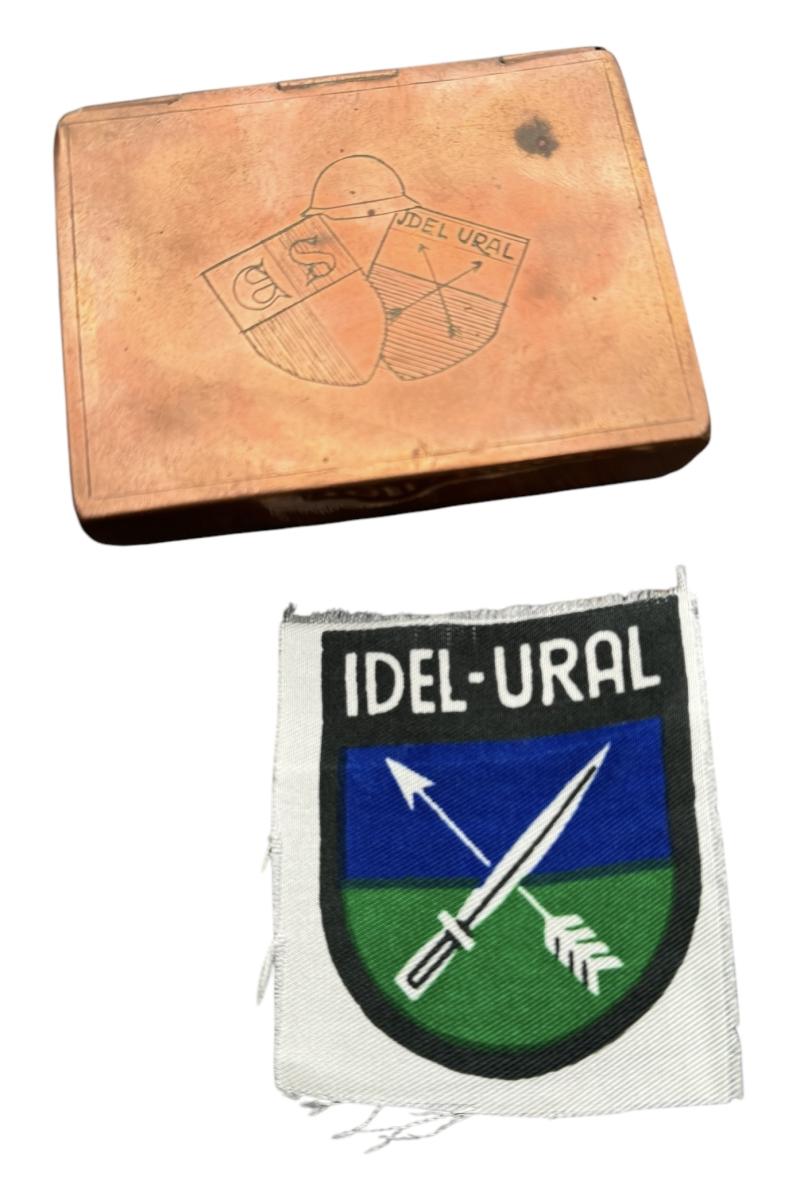 Nice printed Idel-Ural sleeve shield for Ost Völker volunteers in the Wehrmacht with brass field made tabaco/cigarrete bos with initials “E.S.” & “Idel-Ural shield” engraved in the brass.