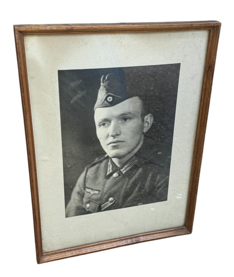 Nice big size (35cm x 26cm) original framed Wehrmacht portrait photograph. Wehrmacht soldier wearing a side cap and an early M36 tunic. In good condition.