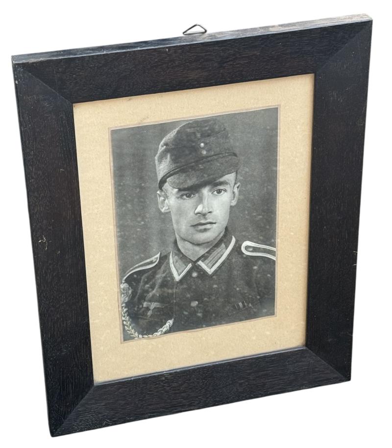 Nice big size (40cm x 32cm) original framed Wehrmacht portrait photograph. Wehrmacht soldier wearing a M43 cap and a sharpshooters lineyard. In good condition.