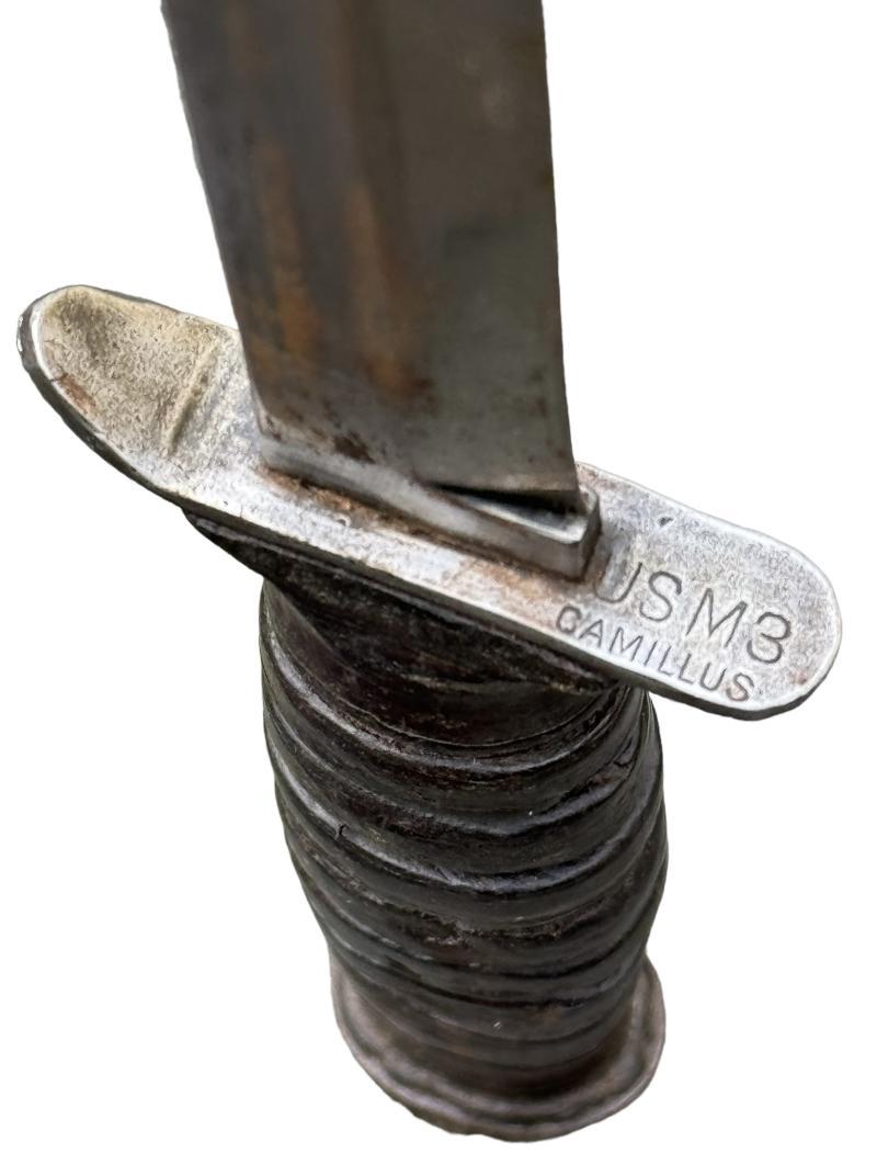 Used but nice untouched US WW2 3th model M3 combat knife made by “Camillus” in very nice used and untouched US WW2 M6 scabbard.