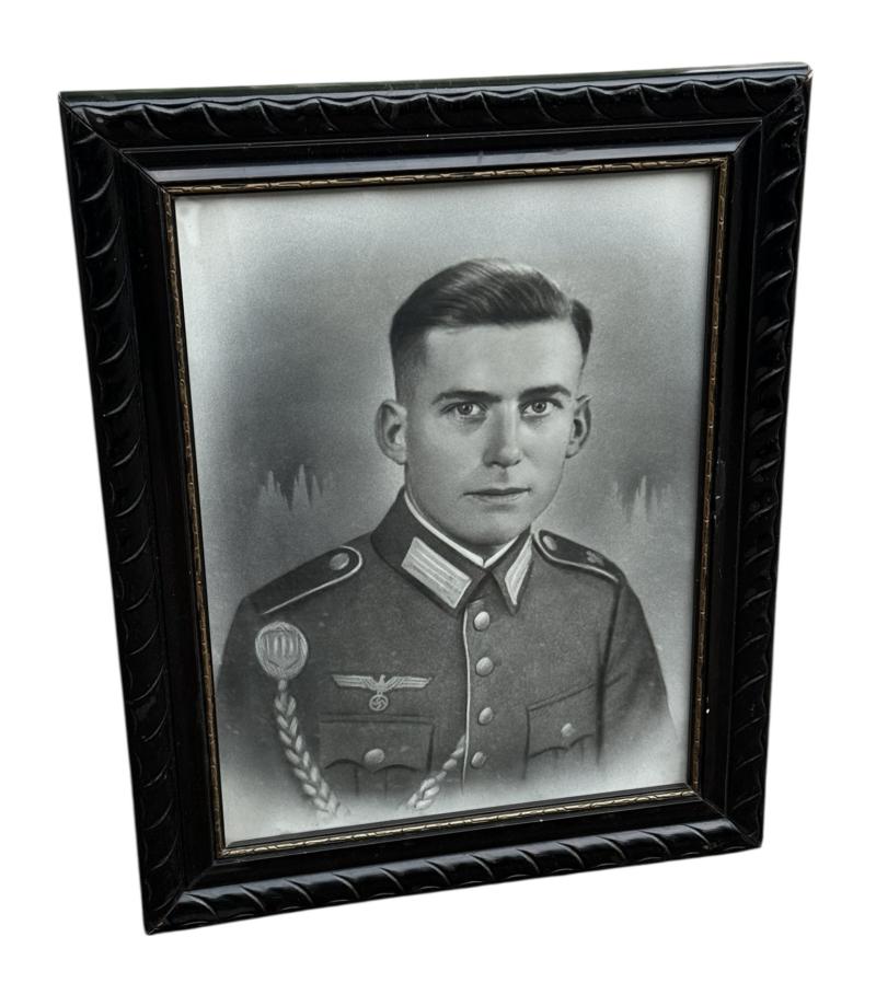 Nice big size (48cm x38cm) original framed Wehrmacht portrait photograph. Wehrmacht soldier wearing a dress tunic the so-called “Waffenrock” In good condition.