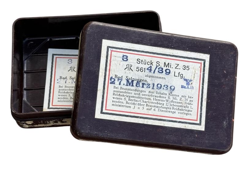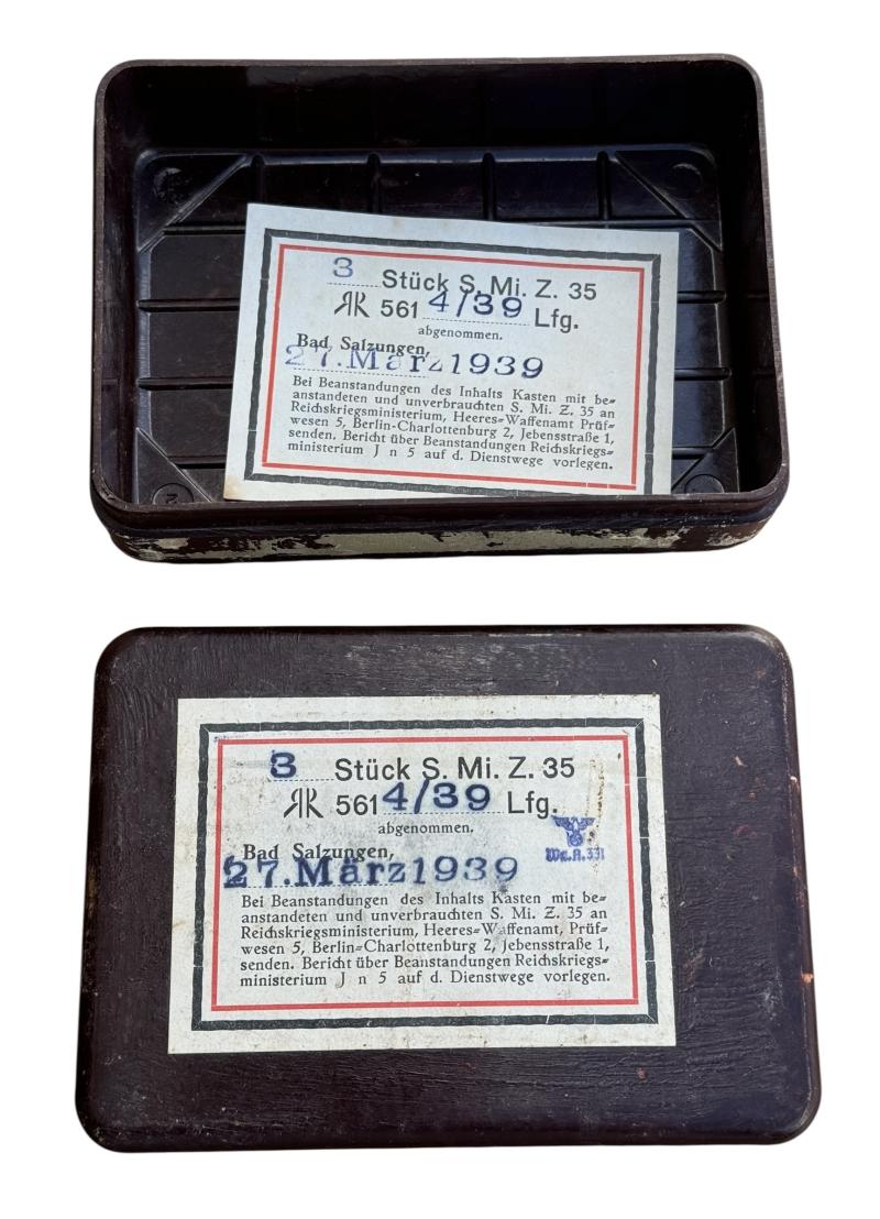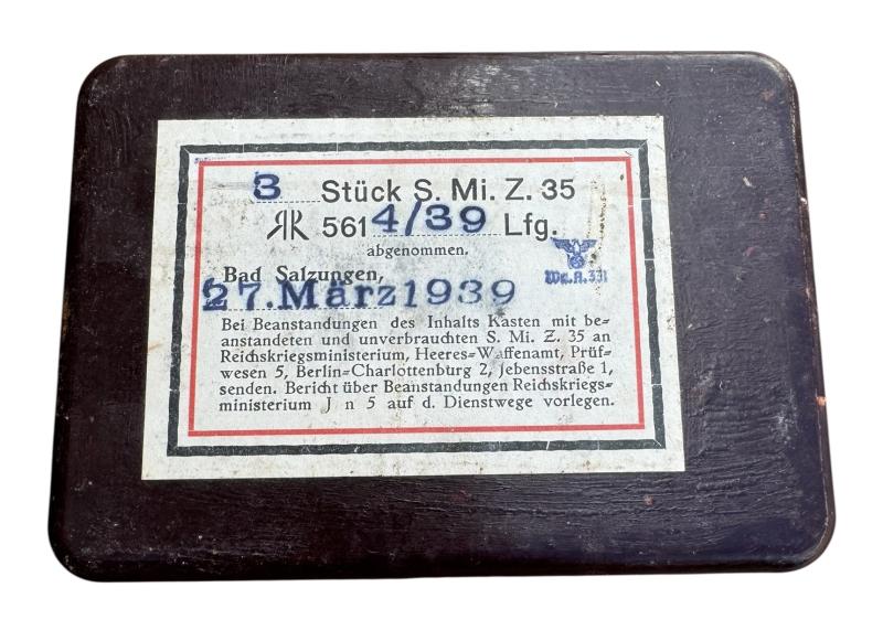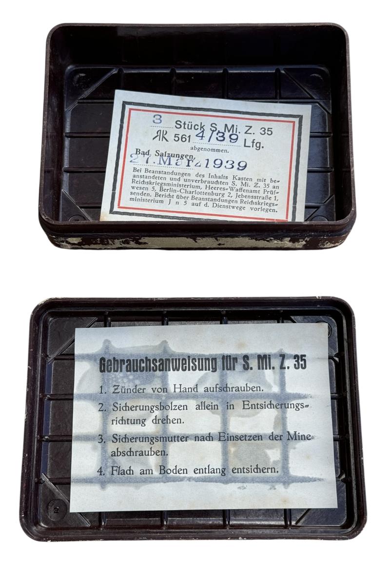 Very nice brown bakelite Wehrmacht fuze box for the “S Mine 35” with all its original paper labels.