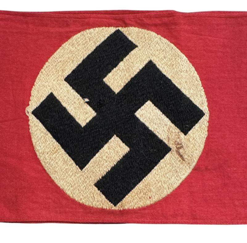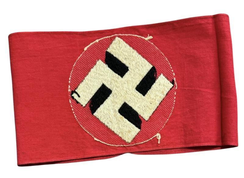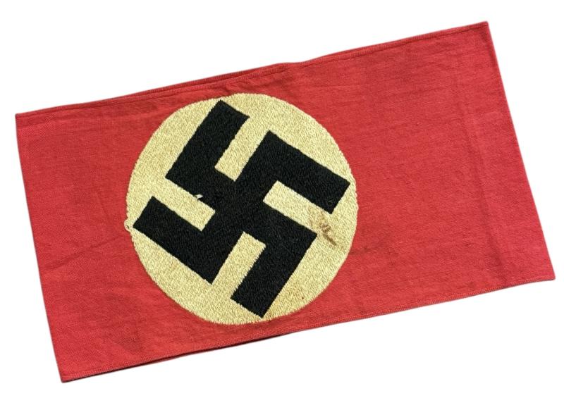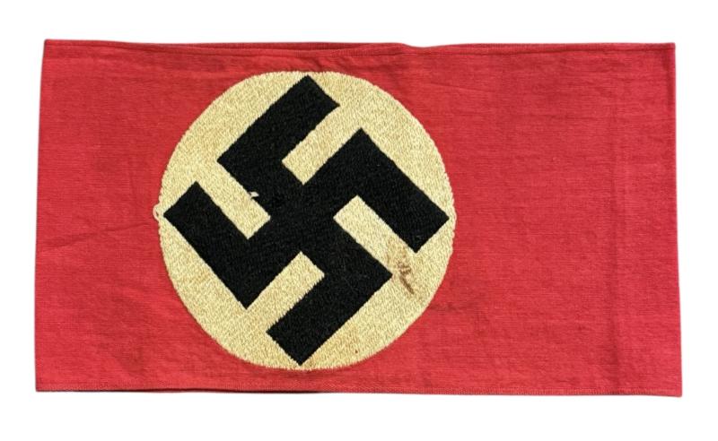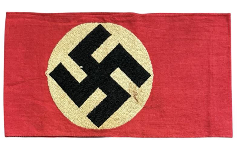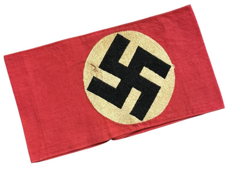 SA/NSDAP Armband Very nice SA/NSDAP armband with machine woven swastika. With district stamp (hard to read) In used but in very good condition. Great to complete a tunic, or as part of an armband collection.