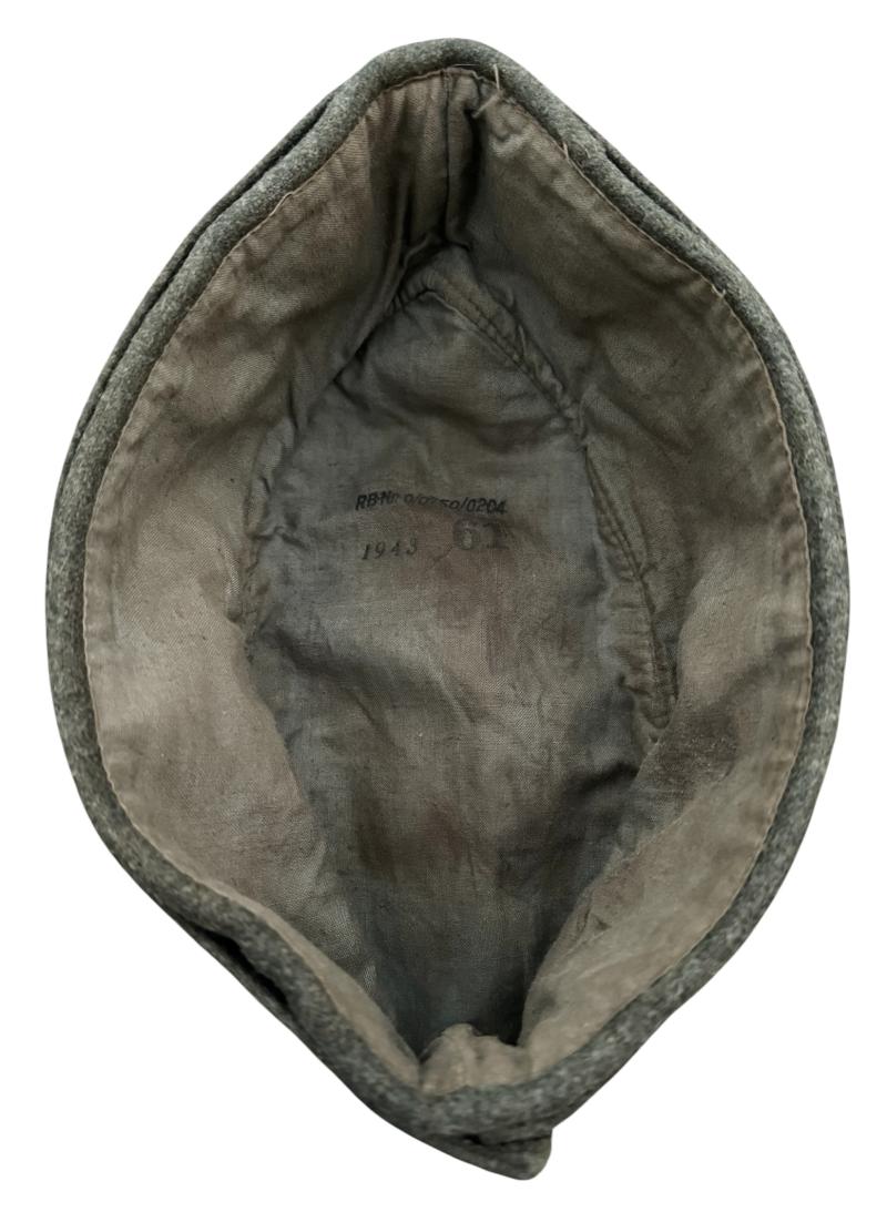 With original hand sewed “BeVo” trapezoid cap insignia. “RBN” number marked, size “61” and dated “1943”. Overal a very nice used wool Wehrmacht M42 side cap in good condition.