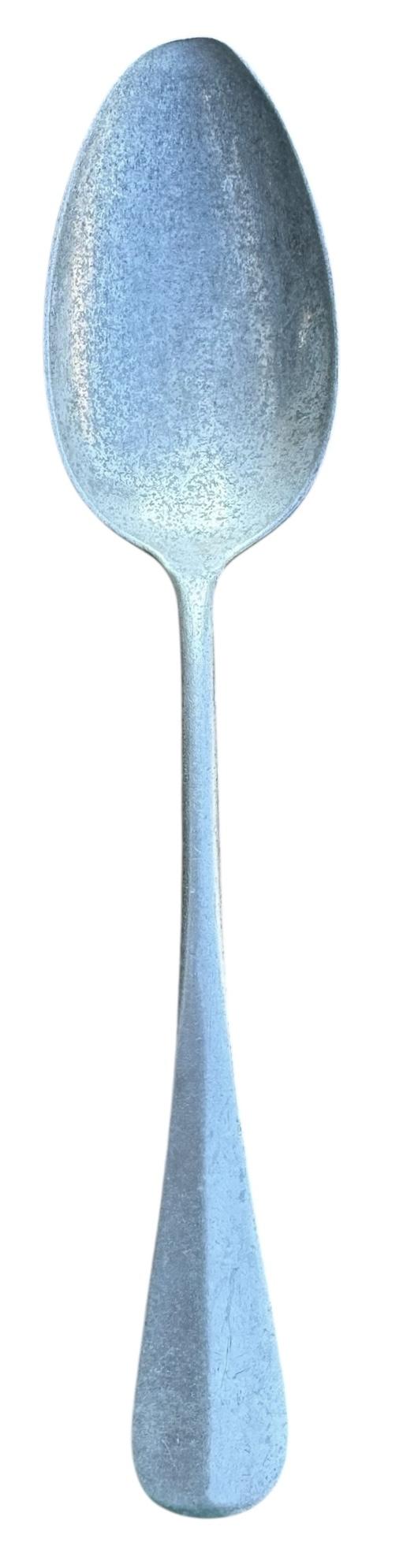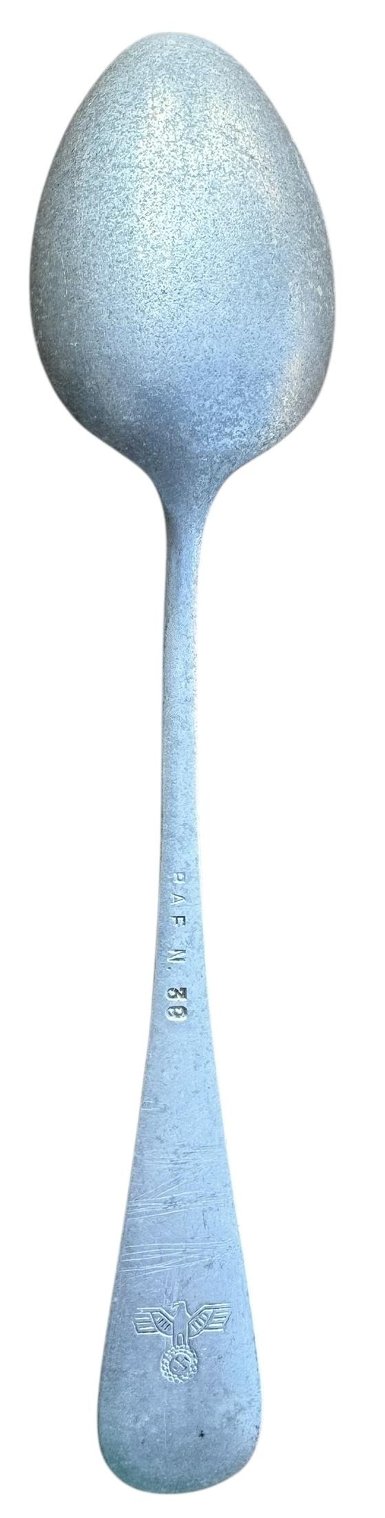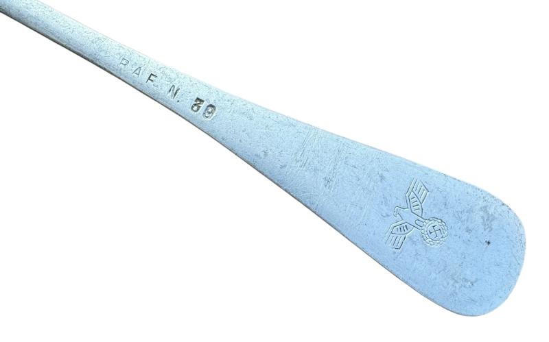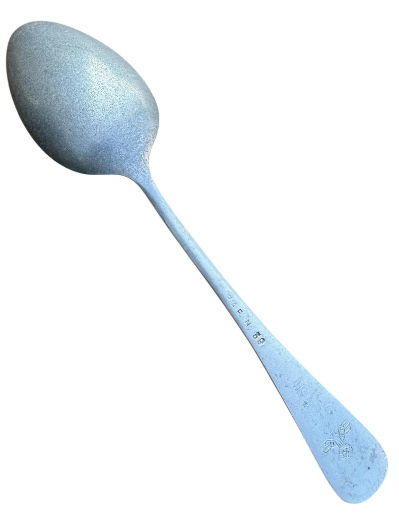 Wehrmacht Messhall Spoon Nice used aluminum made Wehrmacht “Messhall” spoon. Marked with an Wehrmacht eagle. Maker marked “R.A.F.N.” and dated “1939” In used but good condition.