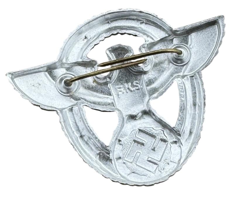Polizei Cap Badge Very nice lightweight (aluminium) made “Polizei” cap badge. Maker marked “FKS”. Both prongs present. Very nice cap badge with great detail, in very good condition. Great to compete a nice visor cap!