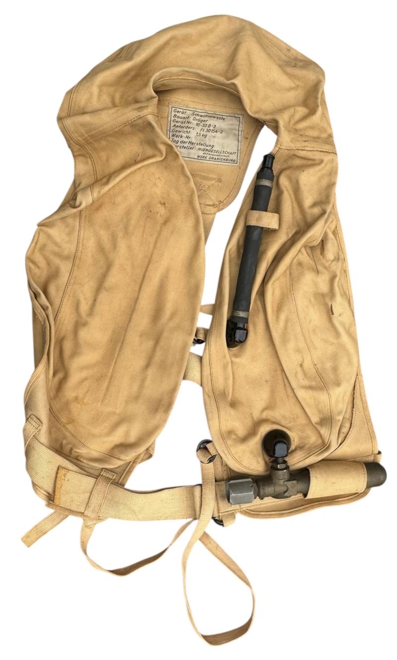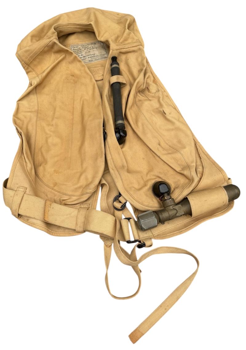 Very nice near mint condition Luftwaffe Pilot/Aircrew Life Vest (Schwimweste). Nicely marked inside with cloth label! complete with the air pressure bottle (with spare seals) and all its straps! Fantastic for a fighter pilot mannequin. Impossible to upgrade!