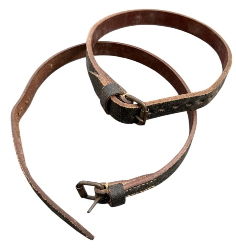 2x leather Wehrmacht utility straps Very nice thick leather Wehrmacht utility straps Both maker code marked and dated “1943” For many purposes. In very good condition.