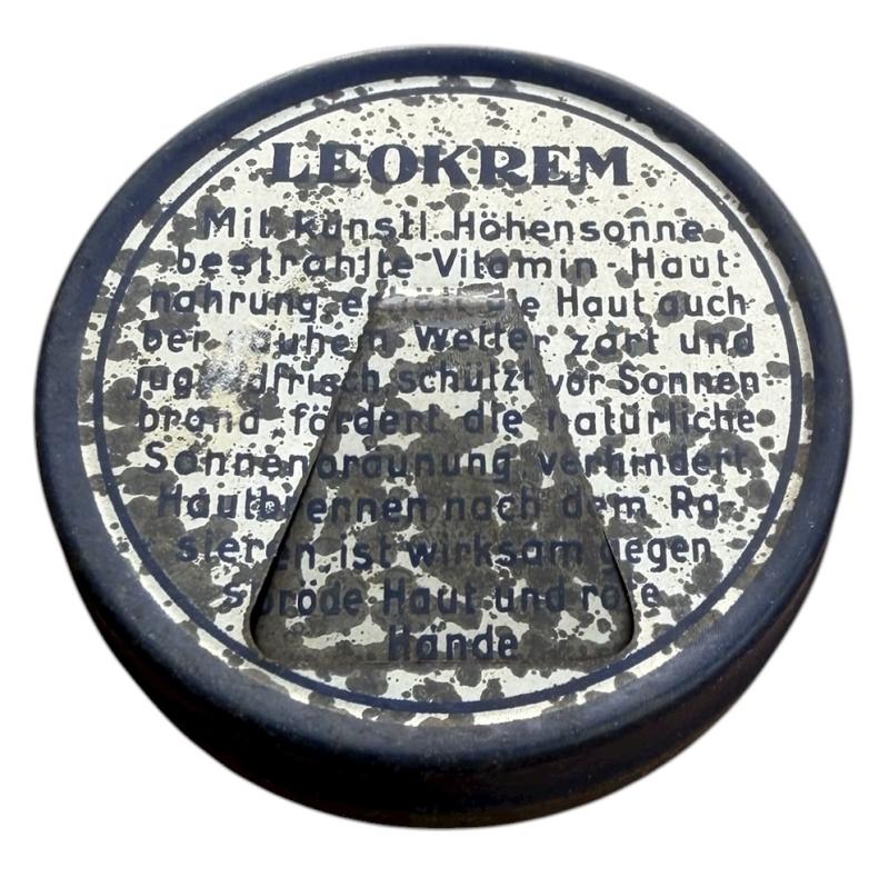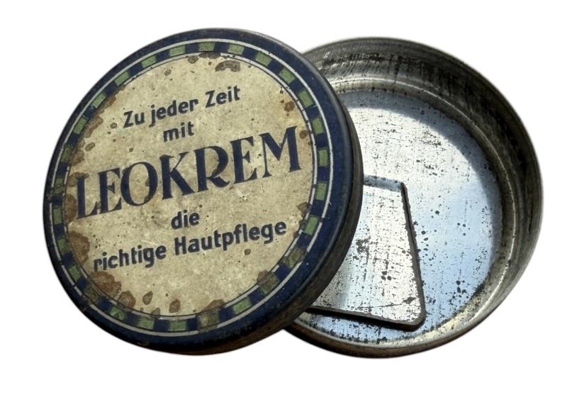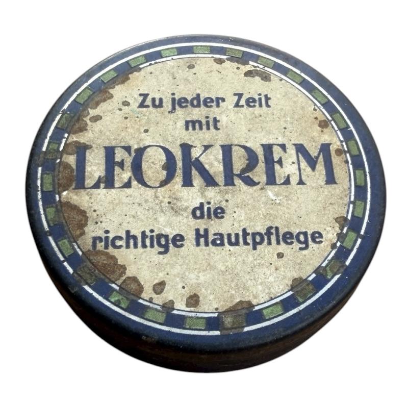 Third Reich era Leokrem (Skin Cream) Very nice metal can “Leokrem” (skin cream) This can never had content, becauce is was made as shop display for on the counter. In very good condition.