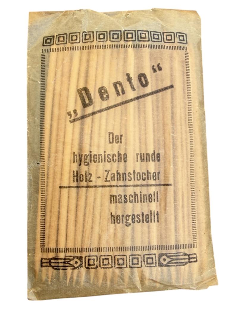 Wehrmacht era Toothpicks Original packaging with content of Wehrmacht era toothpicks. “Dento, der hygienische runde Holz-Zahnstocher” very nice for a personell items collection. In very good condition.