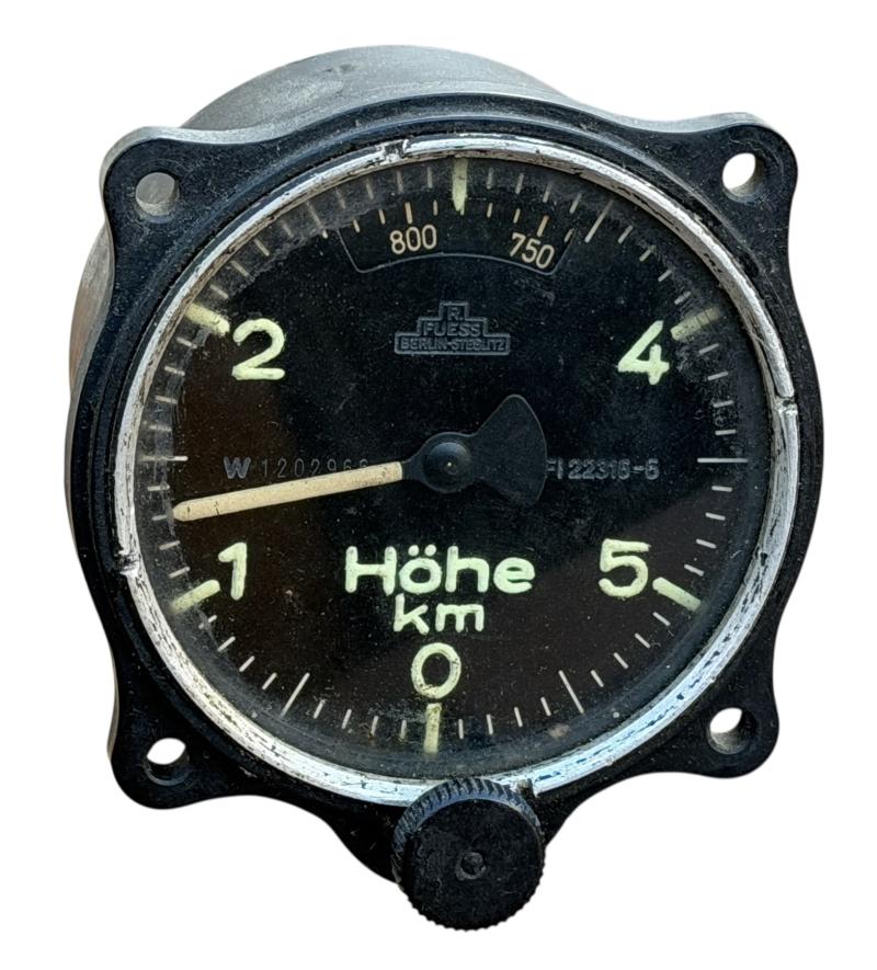 Luftwaffe WW2 Airplane Altimeter So-called “Höhenmesser” Altimeter made by “R. Fuess, Berlin-Steglitz” FL Nr. 223020 In used but in good condition. Great for a Luftwaffe display!