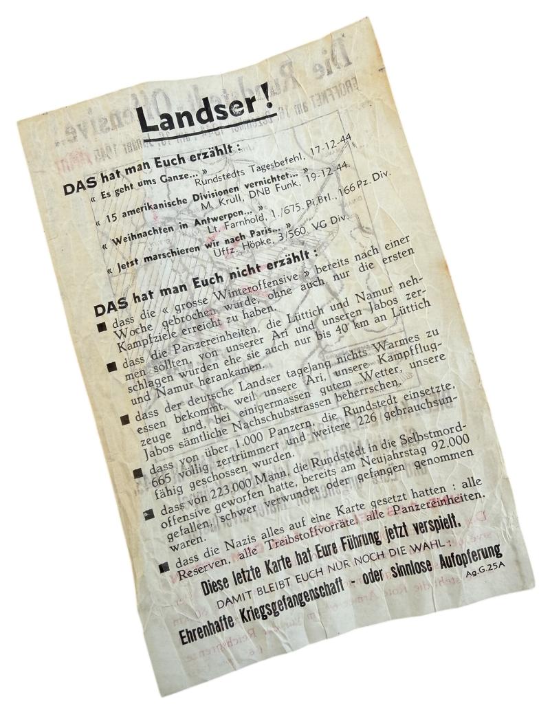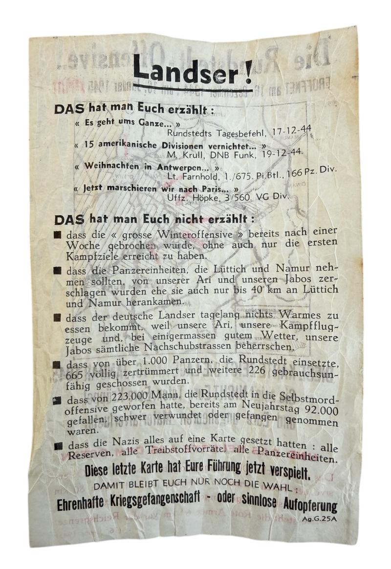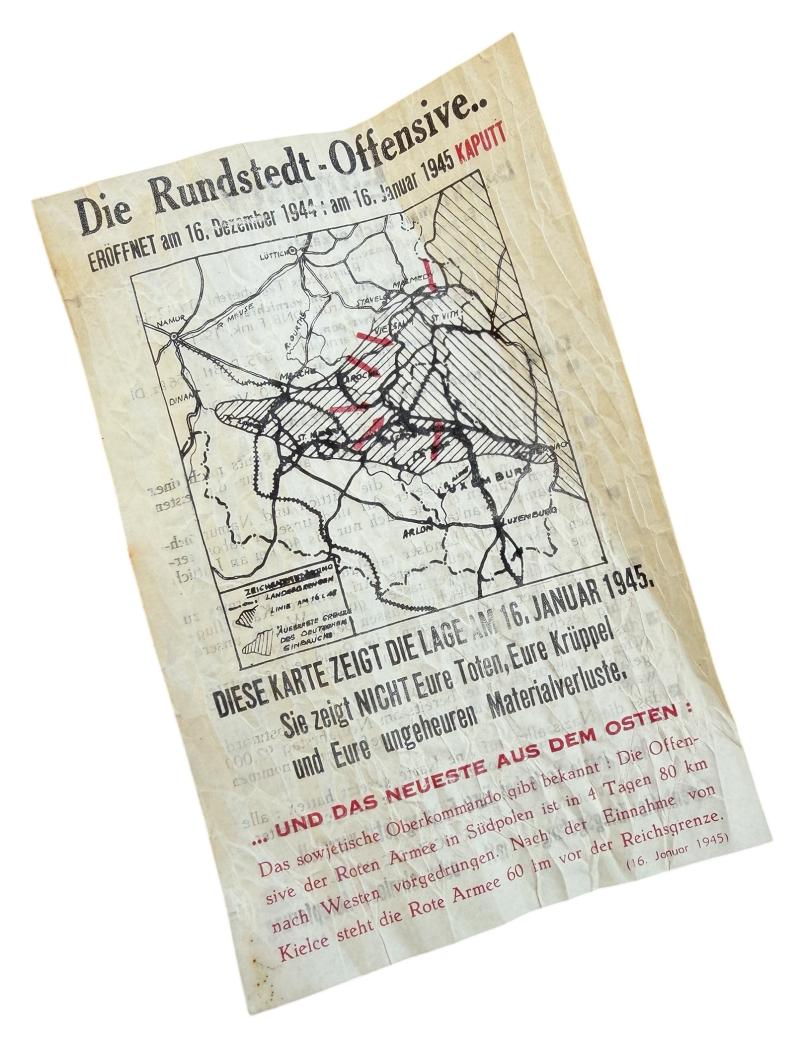 “Die Von Runstedt-Offensive” these allied propaganda flyers would be shoot by Artillery in special ammunition to the German soldiers to de-motivatie them to continue fighting