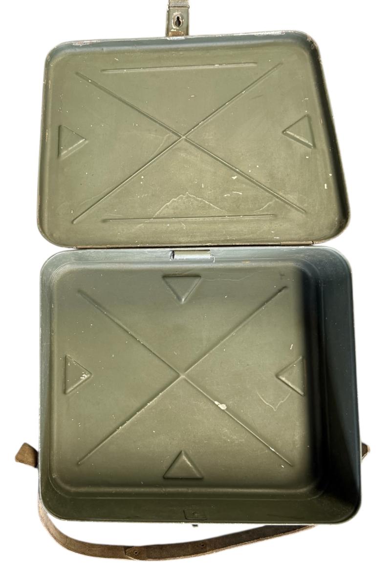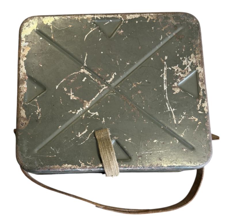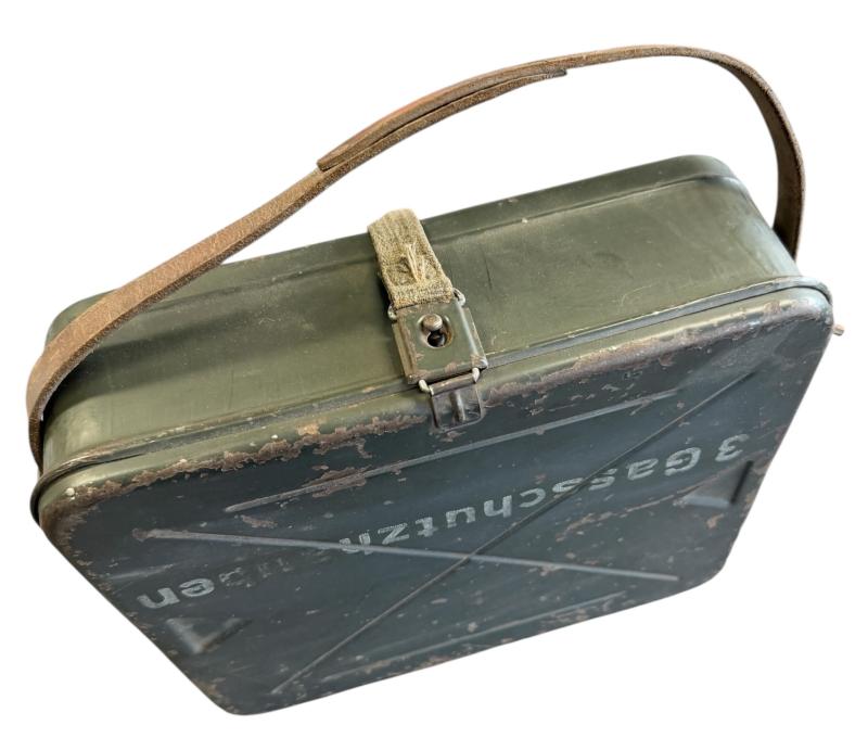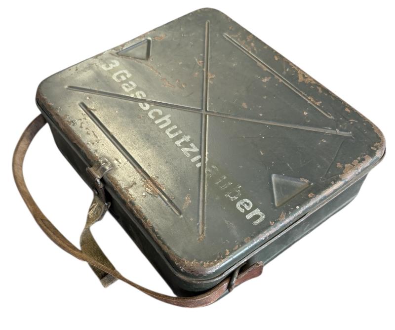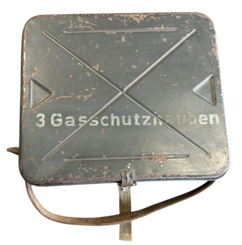 With 3 “Gasschutzhauben” inside (kind of gasmasks for wounded soldiers) Case in its original Wehrmacht fieldgrey camo paint and with its original text.