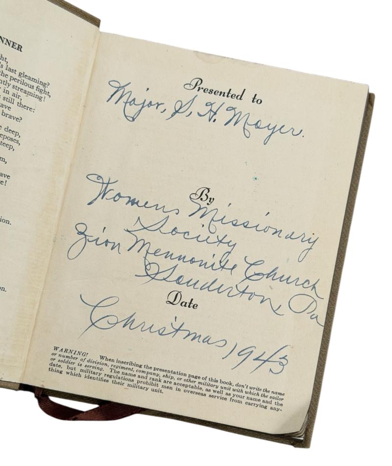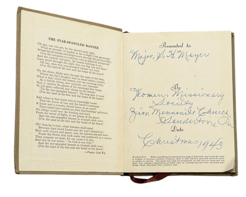 US WW2 New Testament (on name) A gift from an American Church to “Major S.H. Moyer” serving in the US WW2 Airborne Division. dated “Christmas 1943” in used but in very good condition.