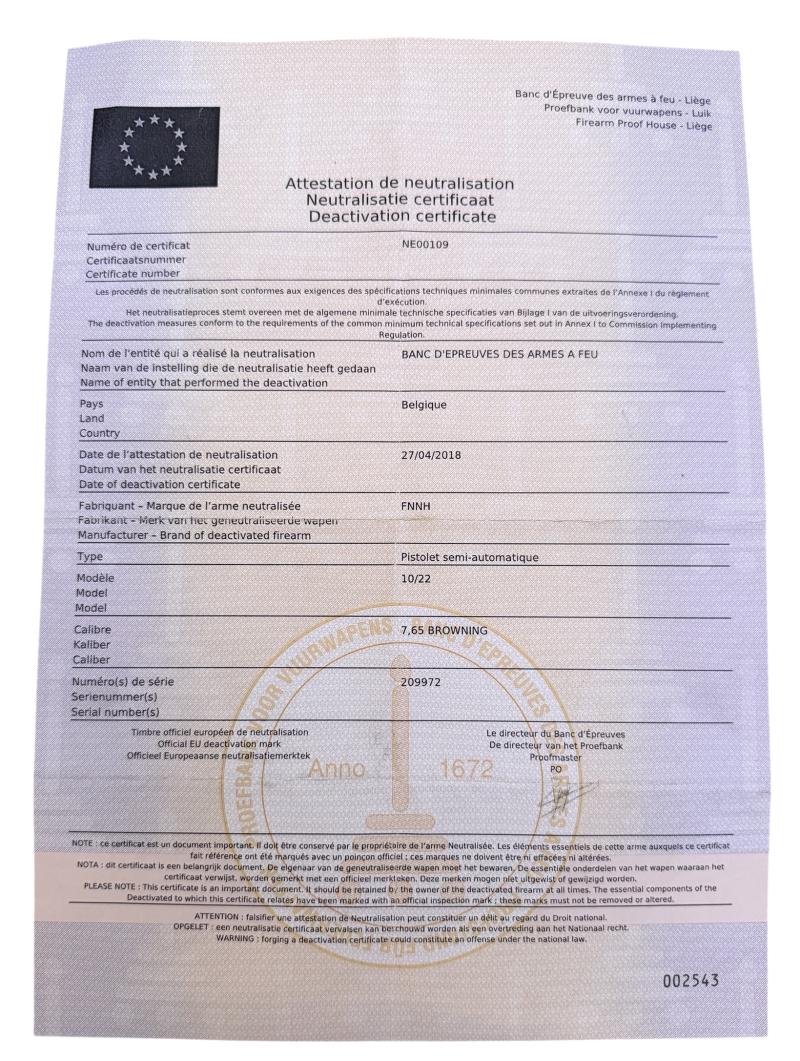 De-activated according EU Law) sold to people over years !! The EU regulation 2015/2403 came about as a result of the attacks in Paris. The regulation applies throughout Europe. In all EU countries, weapons must be disarmed in the manner described in the EU regulation. The disarmed weapons then no longer have to be seen as firearms. The weapons must be provided with a certificate from 1 of the controlling authorities from 1 of the EU countries. They must also be marked by stamped stamps showing the deactivation. From our private collection.