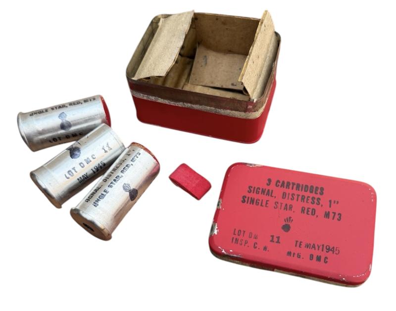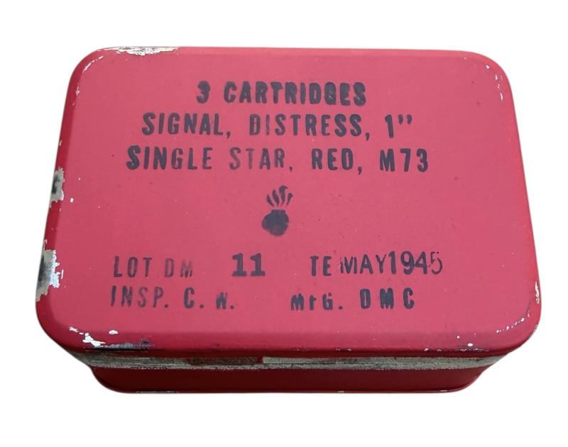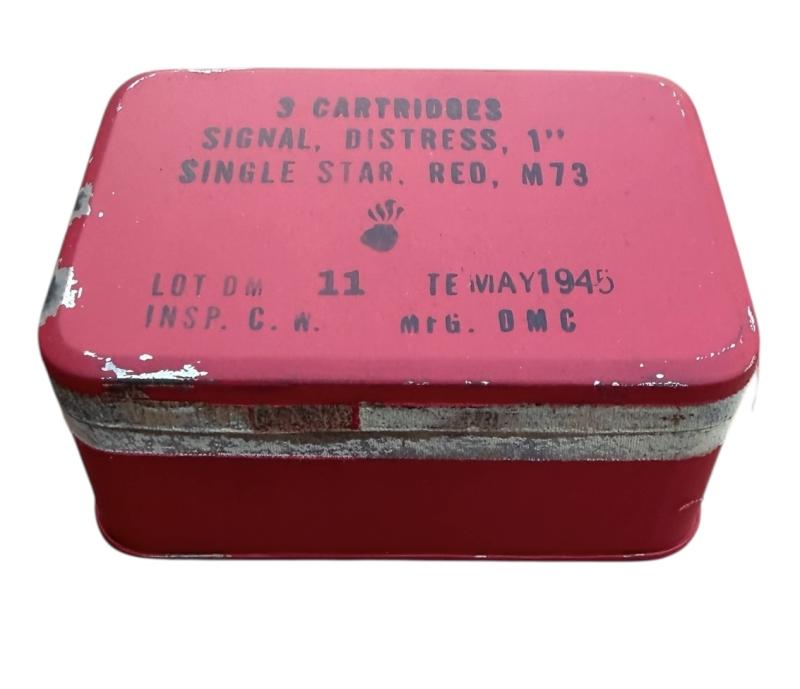 Very nice decorative US WW2 red metal tin with 3 (empty) red flares. Marked “3 Cartridges Signal Destress 1” and “Single Star Red M73”